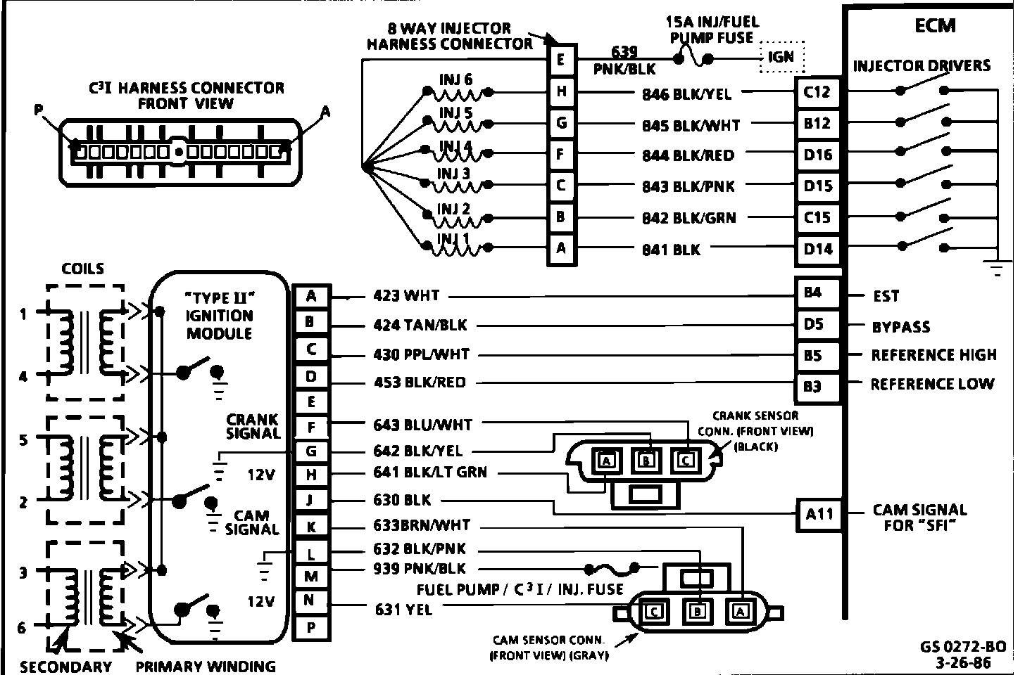 8. Verifies ignition feed voltage at terminal "M" of the C(3)I modules. Less than battery voltage would be an indication of a CKT 639 fault.
