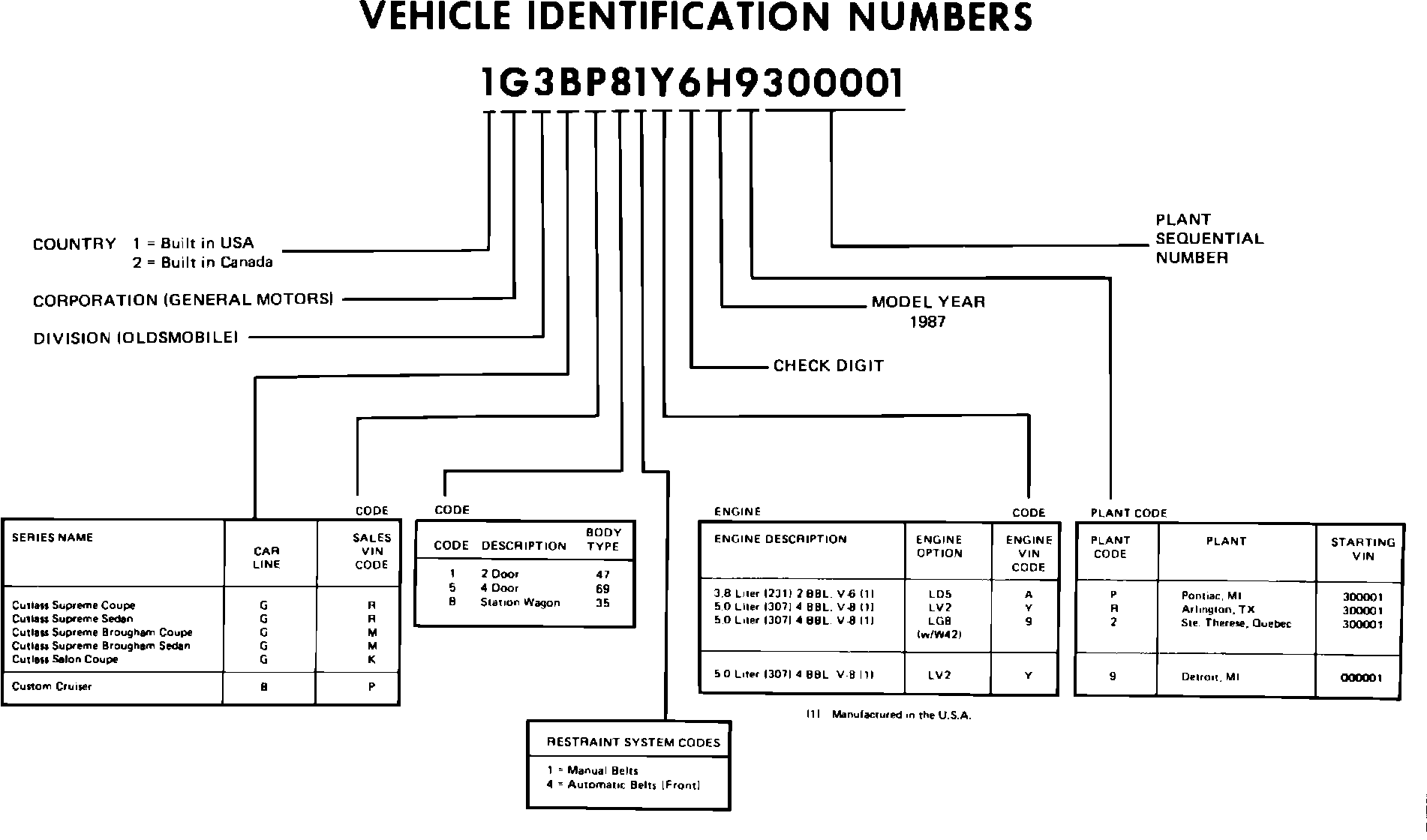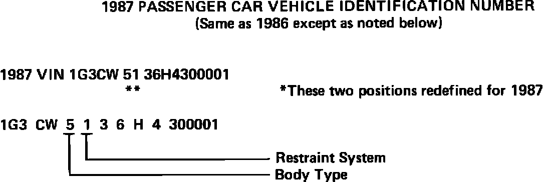 Effective with the 1987 model year, the GM Vehicle Identification Number (VIN) format will be modified for Oldsmobile carlines.. The changes will be made to VIN position numbers 6 and 7 which displayed the passenger car body style in 1986. Example: 1986 VIN 1G3CW 69 36G4300001.