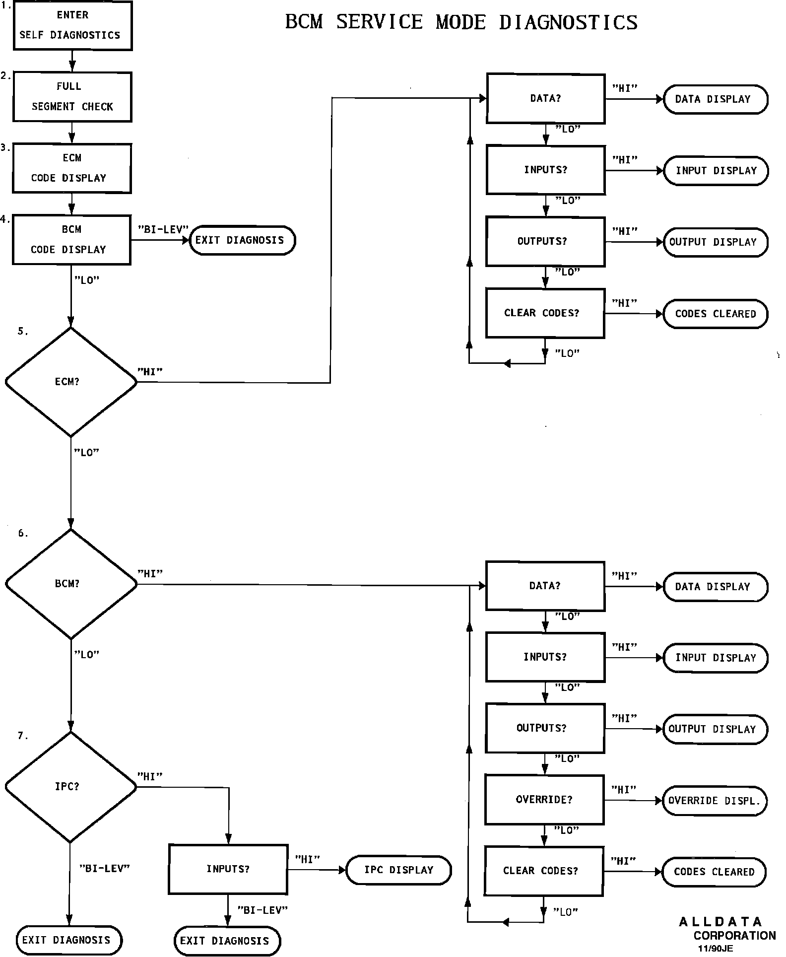 After "Diagnostic Mode" is entered any "trouble codes" stored in computer memory will be displayed. ECM codes will be displayed first. If no ECM trouble codes are stored, the IPC will display a "NO ECM CODES" message for approximately two seconds. All ECM codes will be prefixed with an "E" (i.e.), E013, E014, etc.). For the ECM code assignments, go to "ECM TROUBLE CODE CHARTS". The lowest numbered ECM code will be displayed first followed by progressively higher numbered codes present. Codes will be displayed consecutively for two second intervals until the highest code present has been displayed. When all ECM codes have been displayed, BCM codes will be displayed. The lowest numbered BCM code will be displayed for approximately two seconds. BCM codes accompanied by "Current" indicates the fault still exists. Since the ECM is not capable of making this determination this message does not appear when ECM codes are being displayed. All BCM codes will be prefixed with a "B" (i.e. B110, Blll, etc.). For the BCM code assignments, go to "BCM TROUBLE CODE CHARTS". Progressively higher numbered BCM codes, if present, will be displayed consecutively for two second intervals until the highest code present has been displayed. If no BCM Trouble Codes are stored "NO BCM CODES" message will be displayed. At any time during the display of ECM or BCM codes, if the "LO" fan button on the ECC is pressed, the display of codes will be bypassed. At any time during the display of trouble codes, if the "BI-LEV" button is pressed the BCM will exit "Diagnostic Mode" and go back to normal vehicle operation.