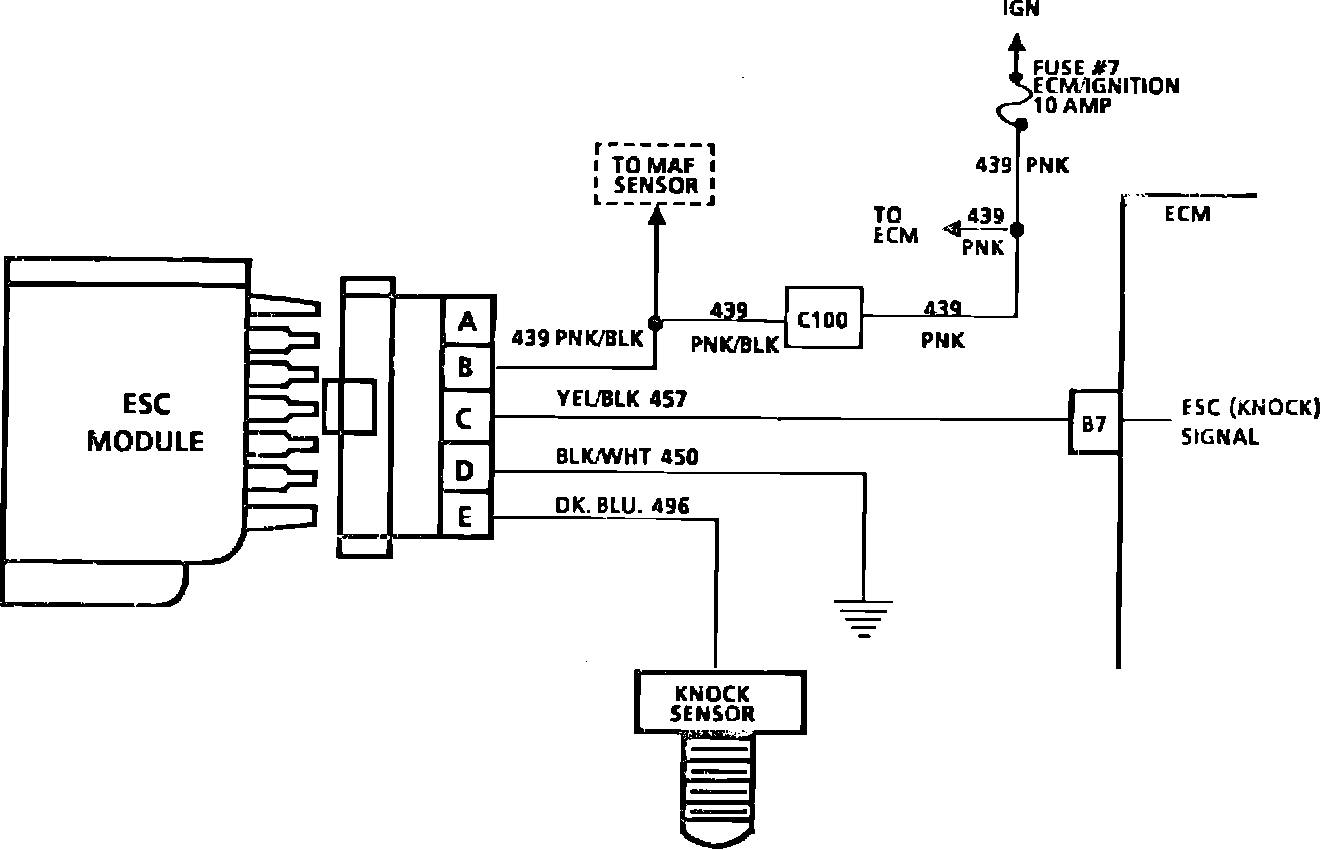 2. By disconnecting the ESC module, the ECM monitors a low voltage at terminal "B7" and should retard the ignition timing.