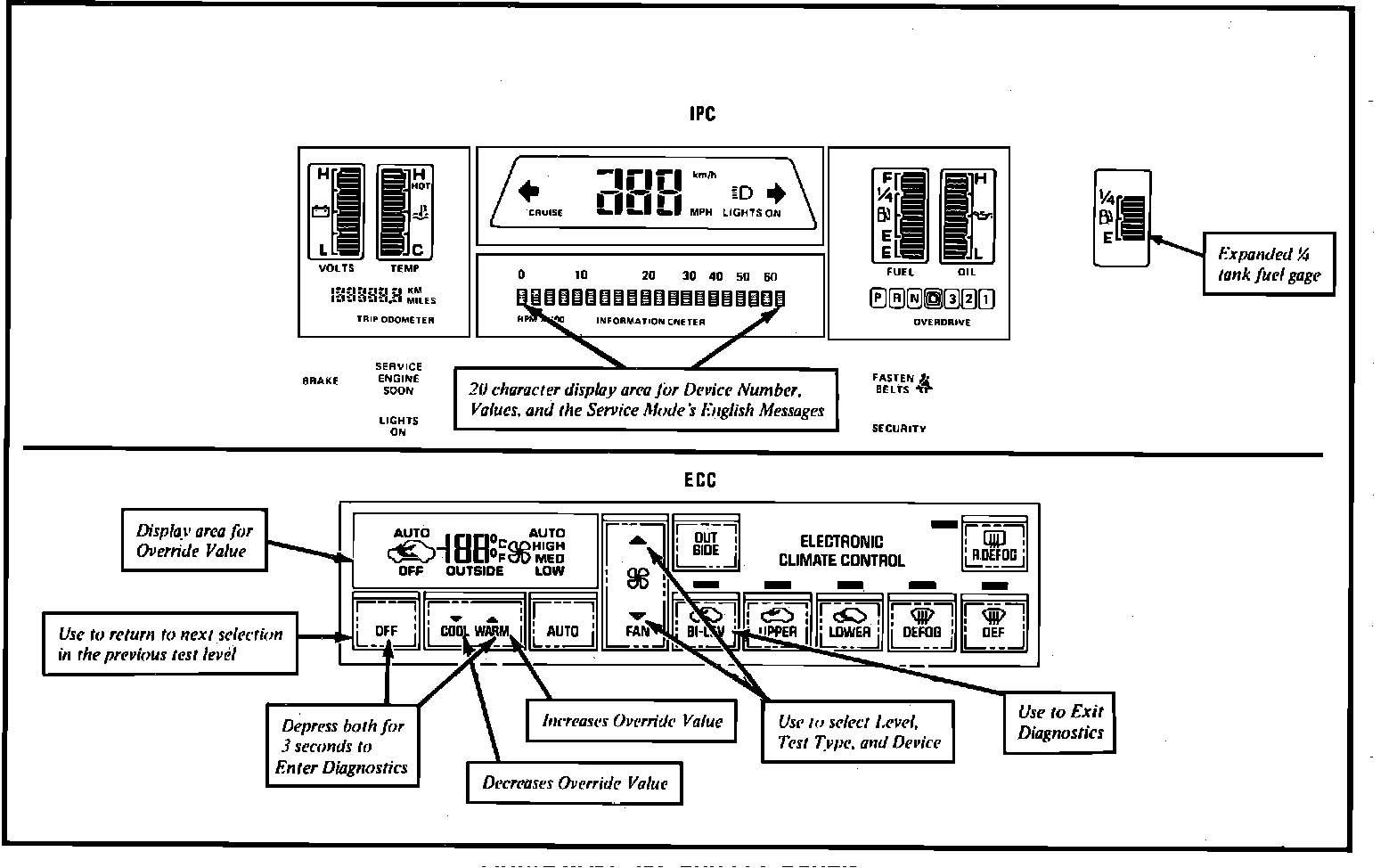 The IPC has a 20 character display area called the information center. During normal engine operation this area displays "Toronado" or is used to display selected engine data such as engine rpm. During diagnostic mode this area of the IPC is used to display ECM/BCM diagnostic codes, ECM/BCM data parameters, and descrete input and output values.