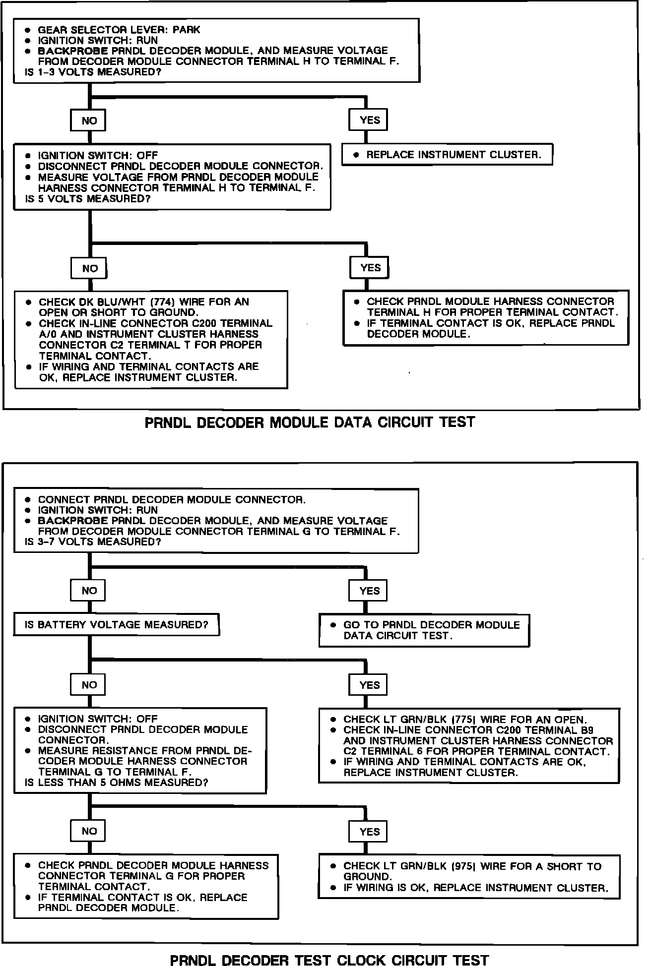 The PRNDL DECODER MODULE EXCHANGE TEST, found in the above mentioned Service Manuals is not practical due to the lack of new parts to tryout at dealerships. It also reflects a "parts changing" altitude toward diagnosis which should be discouraged.