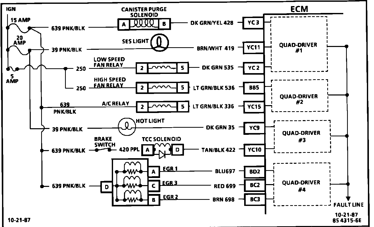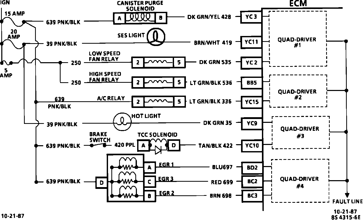 3. This test will determine which circuit is out of specifications. All circuits EXCEPT "YC11", the SES light, and "YC9", the "hot light", should be B + when key is "ON", engine not running. The diagnostic test terminal is not grounded.