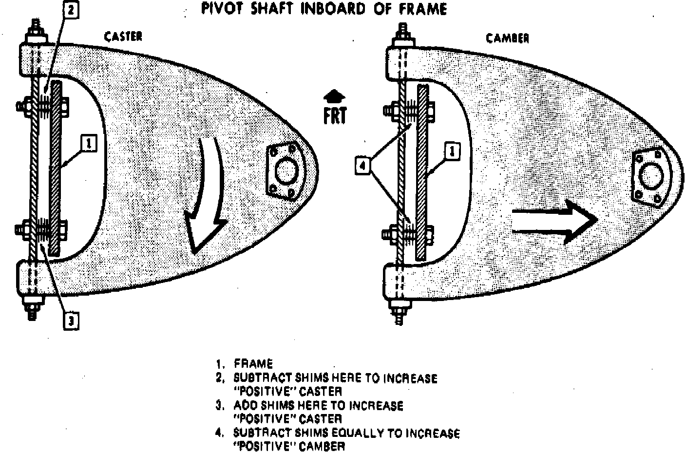 Caster and camber angles can be adjusted by adding, subtracting or transferring shims between upper control arm shaft and frame bracket. Caster is adjusted by transferring shims from front to rear or rear to front, whereas camber is adjusted by changing shims at both the front and rear of the shaft.