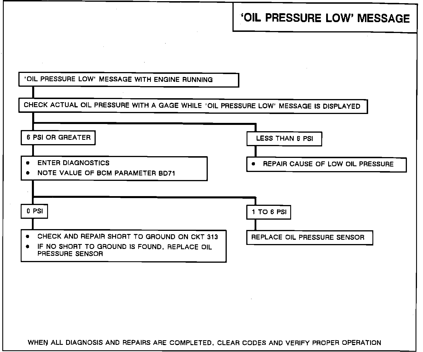 The BCM provides voltage to the oil pressure circuit, and the oil pressure sensor provides the single path to ground. The BCM supplies and internally monitors the voltage level of the circuit at pin 3C3/3D9. The sensor acts like a variable resistor, when the oil pressure is high, resistance is high, and the BCM will detects high voltage. As the oil pressure decreases so will the voltage level sensed by the BCM at pin 3C3/3D9. The BCM will then calculate the oil pressure by the amount of voltage present, and when the calculated oil pressure drops below 6.0 psi, and all other failure conditions have been met, the BCM will send the "LOW OIL PRESSURE" message to the IPC. The BCM will also flash the oil can next to the oil pressure gauge on the IPC and activate the medium paced chime on the chime module.