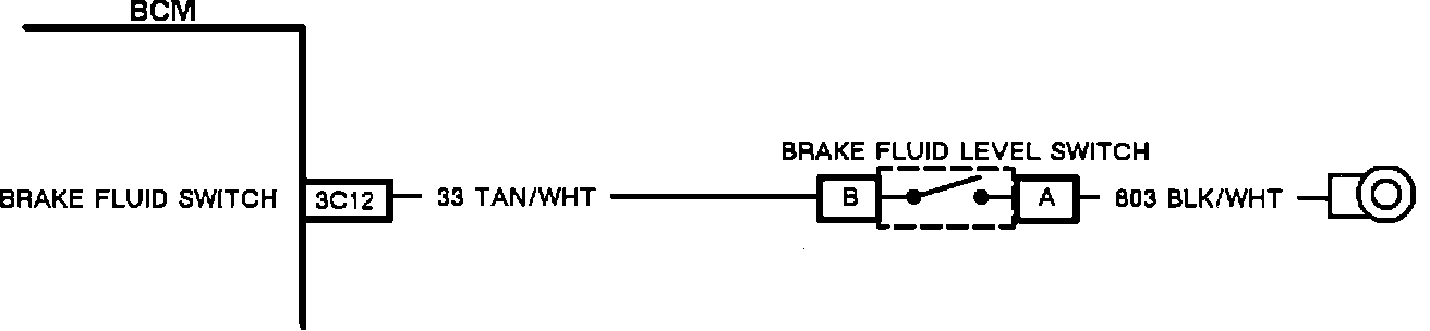 The BCM provides system voltage to the brake fluid level circuit, and the brake fluid level switch provides the single path to ground. The BCM supplies and internally monitors the voltage level of the circuit at pin 3C12. When the brake fluid level circuit is open the BCM detects system voltage, but if the brake fluid level switch provides a path to ground (low brake fluid level in the reservoir), the BCM will detect low voltage. Once the BCM has determined that all the of the failure conditions have been met, it will send the "BRAKE FLUID LOW" message to the IPC. The BCM will also illuminate the "BRAKE" indicator on the IPC and will activate the fast paced chime on the chime module.