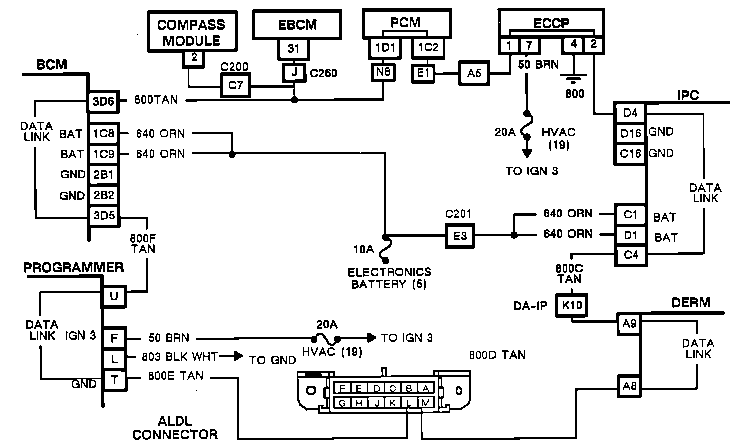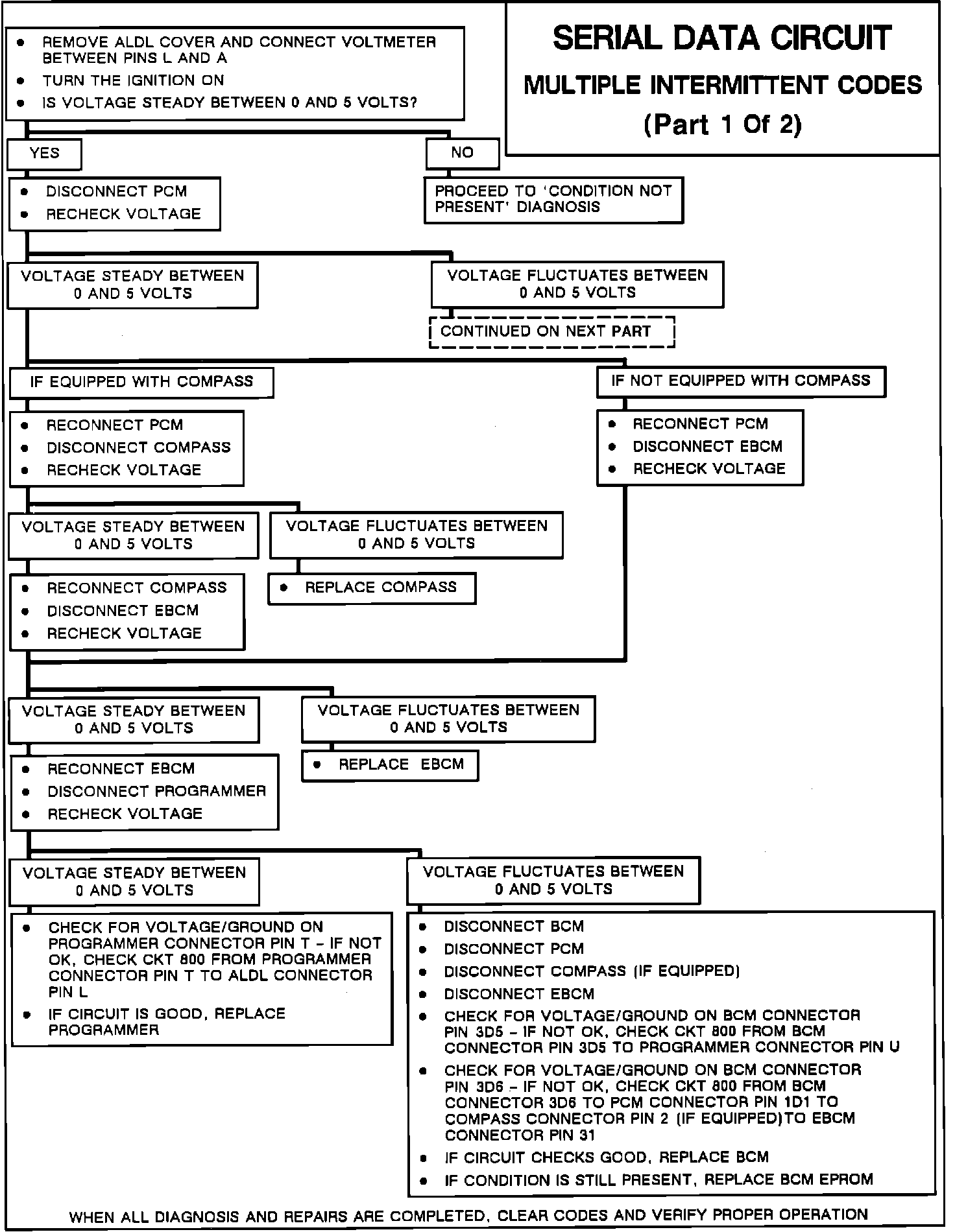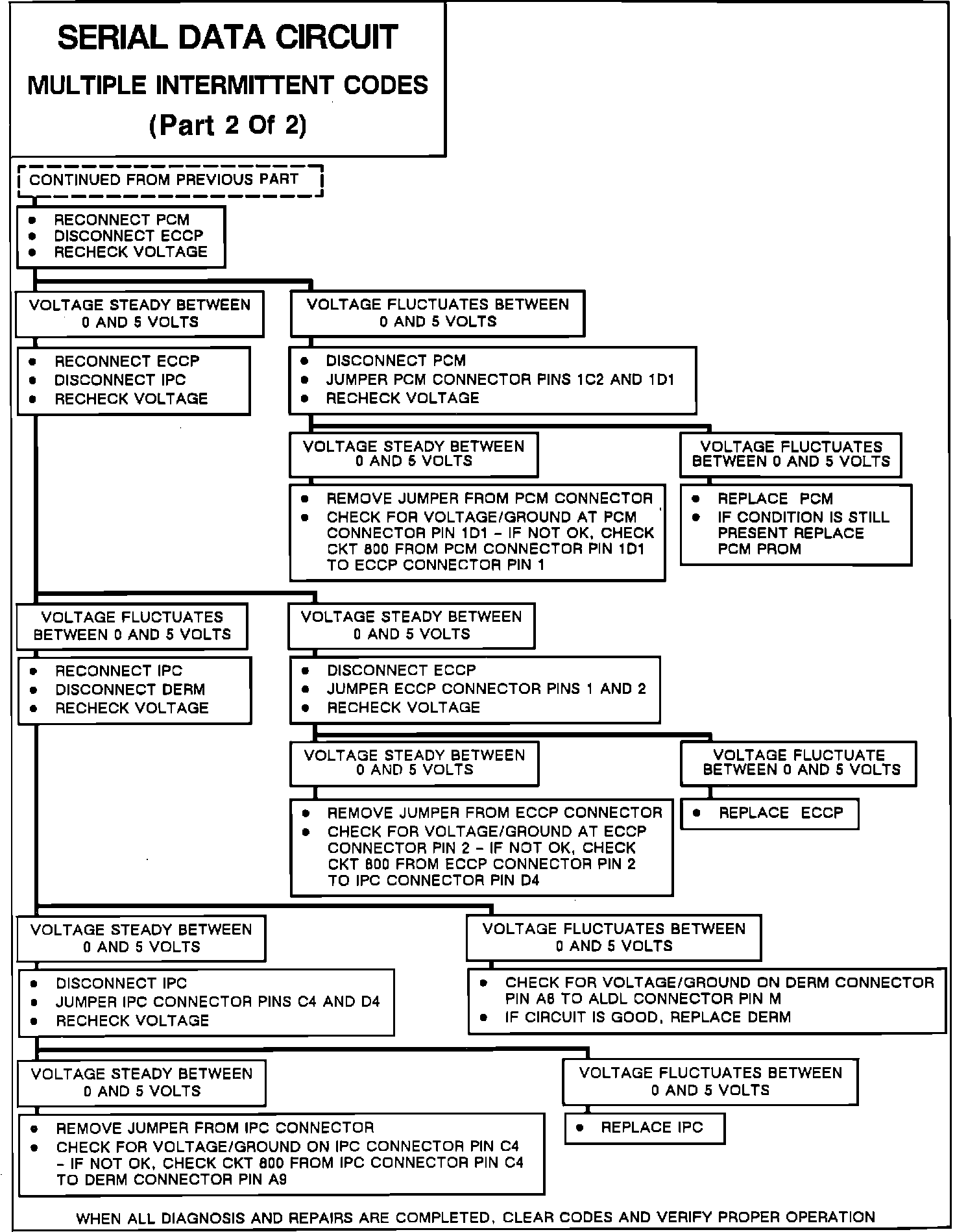 If the serial data line has been shorted to ground, the voltage at the ALDL will be 0 volts. If it has been shorted to voltage, it will be over 5.0 volts. If one of the components on the serial data line is affecting the data line voltage, the serial data voltage at the ALDL connector will be a steady value anywhere between 0.1 and 5.0 volts.