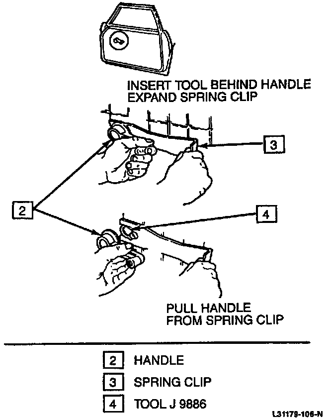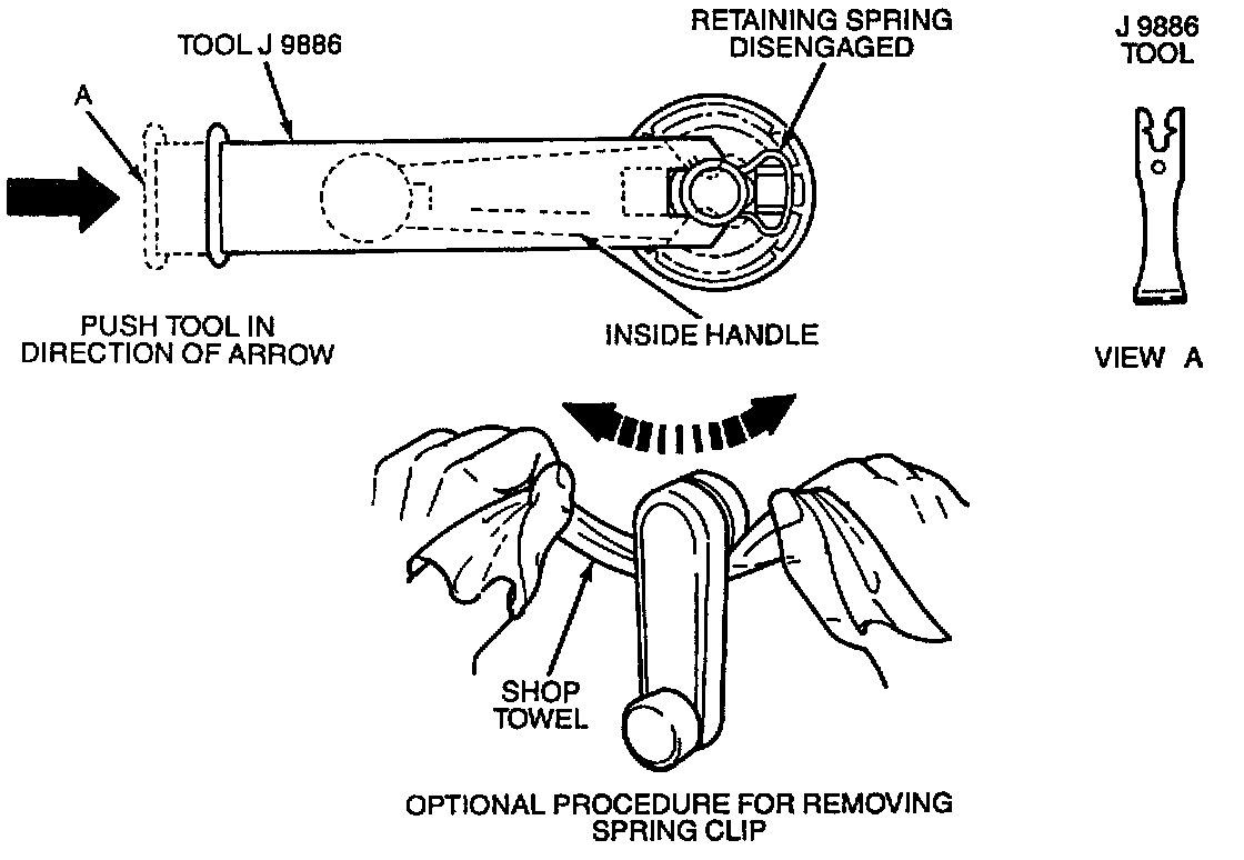 1. Spring clip by inserting tool J 9886 between handle and trim panel (Figures 21 and 22).