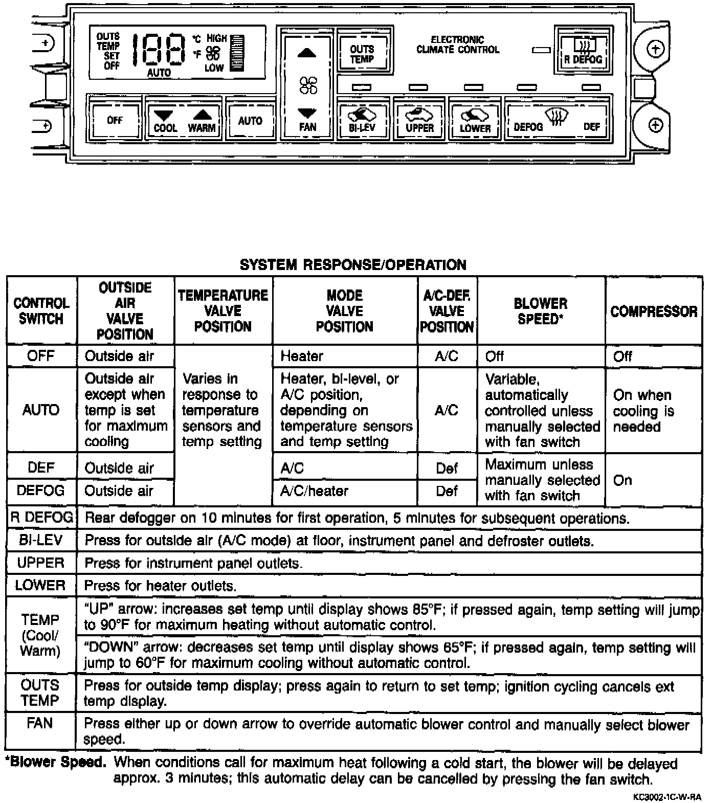 The automatic A/C control assembly, uses short- travel, soft-touch buttons for selecting the mode, temperature and blower speeds manually, if desired. In the automatic mode, the desired temperature is set by the driver and a microprocessor utilizes this information along with the two air temperature sensor inputs to provide the desired comfort level. The driver can override the auto blower speed and mode selection, if desired. For example, if a different mode is selected, the microprocessor will continue to moderate the blower speed and temperature.