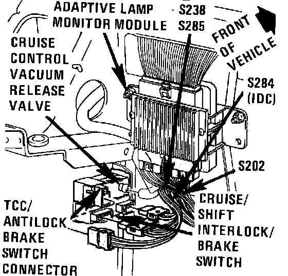 Component Location View. Behind LH Side of I/P, Right of Steering Column: