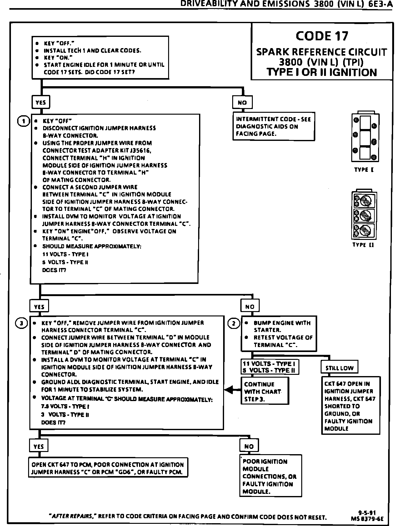 This bulletin updates the Code 17 Diagnostic Chart in "Driveability And Emissions" Section 6E3 (page 6E3-A-48 for the 1991 Ninety Eight, and page 6E3-A-54 for the 1992 Eighty Elght and Ninety Eight) and applies only to those models equipped with the 3800 (VIN L) engine. This bulletin includes diagnostic charts for use with "Type I" and "Type II" ignition systems. To ensure proper diagnosis and to allow replacement of good parts, the type of system being diagnosed must be identified. The "Type I" ignition module is identified by 2 rows of coil towers and a single coil pack containing all 3 coils. "Type II" ignition modules have all 6 coil towers on the same side of the module and individually replaceable coil packs.