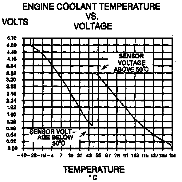 The PCM supplies a 5 volt signal to the engine coolant temperature sensor through a resistor in the PCM and measures the voltage. The voltage will be high when the engine is cold, and low when the engine is hot. By measuring the voltage, the PCM calculates the engine coolant temperature. The scan tool displays engine coolant temperature in degrees. After engine startup, the temperature should rise steadily to about 90°C (194°F) then stabilize when thermostat opens. If the engine has not been run for several hours (overnight), the engine coolant temperature and intake air temperature displays should be close to each other.
