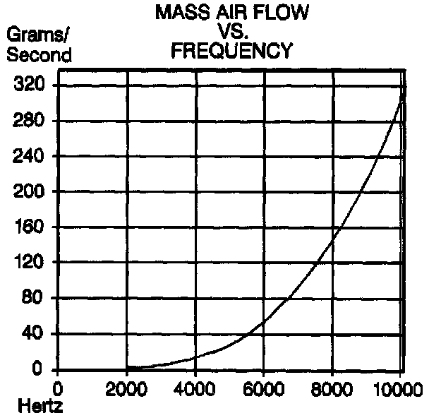 The Mass Air Flow (MAF) sensor used on this vehicle is a hot wire type and is used to measure air flow rate (mass/unit time). The MAF sensor output is a variable frequency square wave based on air mass traveling, through the sensor. A low frequency output signal from the MAF sensor indicates low air flow and high frequency indicates high air flow.