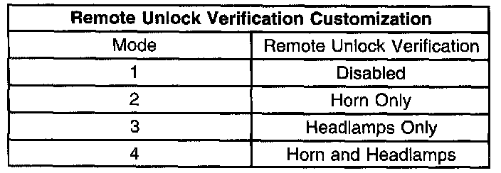 The chime will bong one to four times, equal to the current customization mode, to indicate which mode the vehicle is in. Each additional time the transmitter UNLOCK button is pressed, the mode number will advance. A transition past mode four will repeat starting again at mode one.