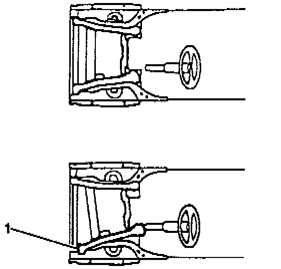 Check the frame for any obvious damage. In the illustration, the frame (1) is moved toward the rear. The left lower control arm and the left ball joint are moved toward the rear, changing the caster on the left side only. The top of the strut cannot move because the strut is mounted to the strut tower in the body.