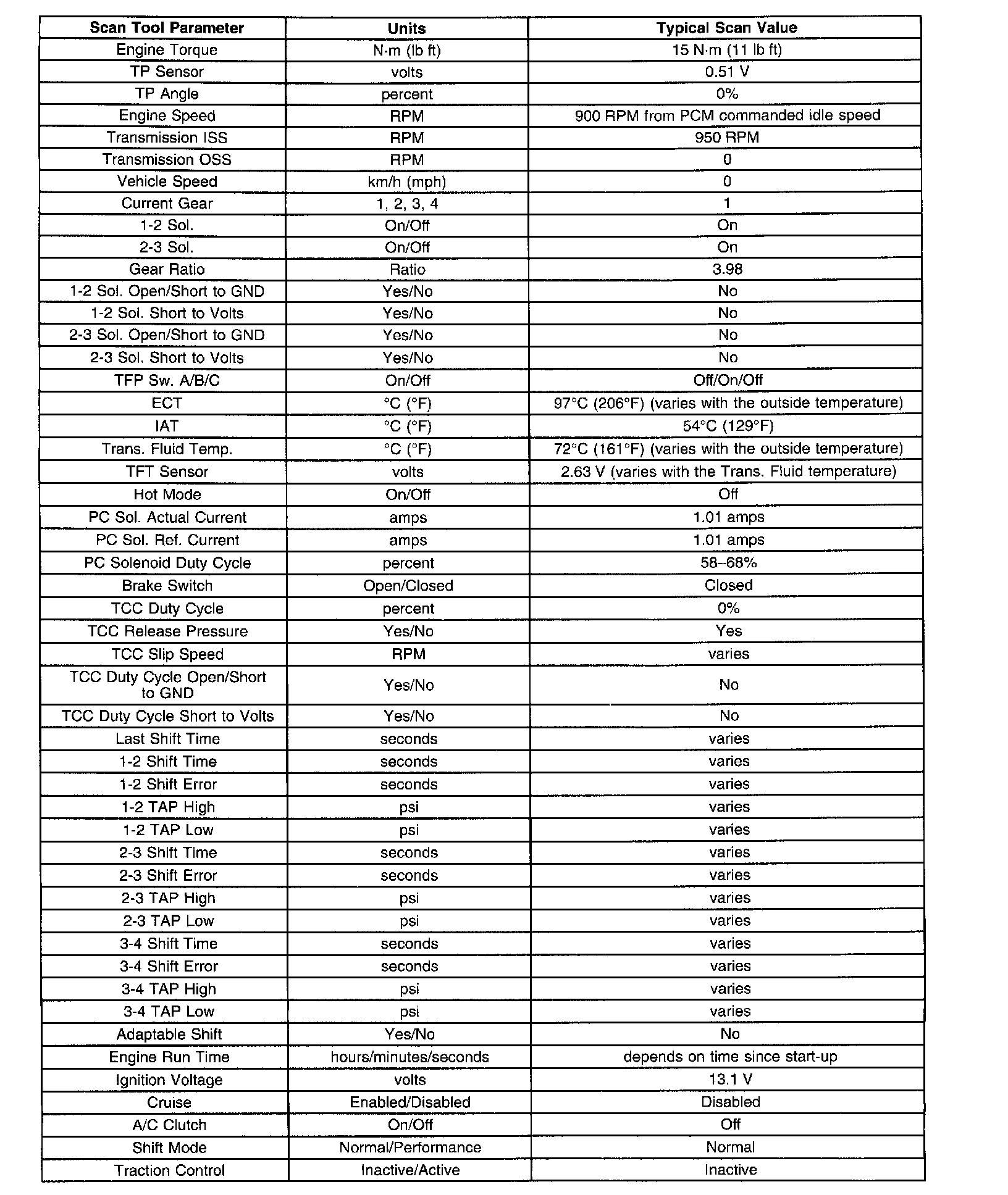 If you have completed the On-Board Diagnostic (OBD) system check, if the diagnostics are functioning properly and if no DTCs display, you may use the values in the table below for comparison within the appropriate transmission. These typical values are an average of display values recorded from normally operating vehicles. They represent the display from a normally functioning system.