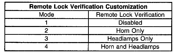IMPORTANT: If the ignition switch is moved to the OFF position or any vehicle door is opened during this procedure, the remote unlock verification customization will be terminated and the system will remain in the most recent mode.