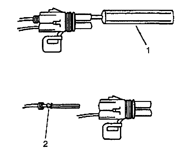 ^ Insert the Weather Pack(R) terminal removal tool into the front (mating end) of the connector cavity until it rests on the cavity shoulder (1).