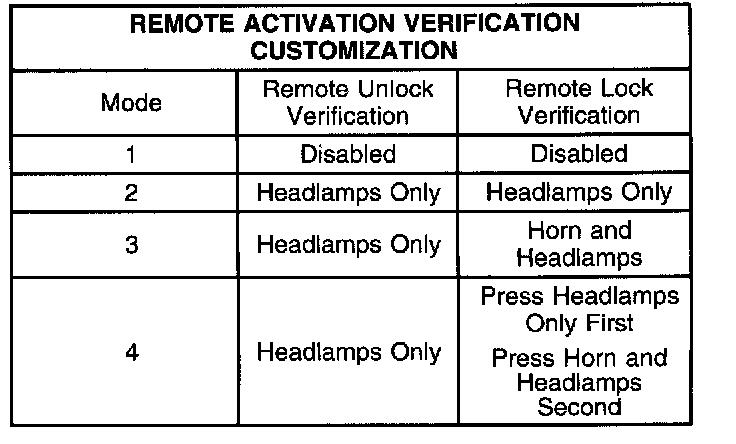 2. Turn the ignition to the ACC position. The seat belt telltale flashes and the chime bongs 1-4 times, equal to the current customization mode. This indicates which mode the vehicle is in. Each time the transmitter LOCK button is pressed, the mode number advances. A transition past mode 4 will repeat, starting again at model.