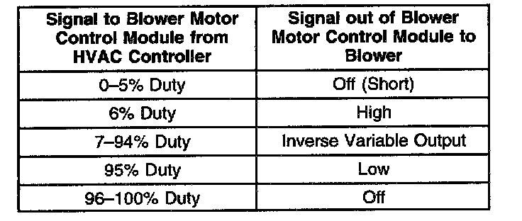 The blower motor controller module contains solid state circuitry. At a given duty cycle, the circuitry utilizes a pulse width voltage signal from the control head. The circuitry returns an inverse pulse width signal to the blower motor.Blower Control Module Signals: