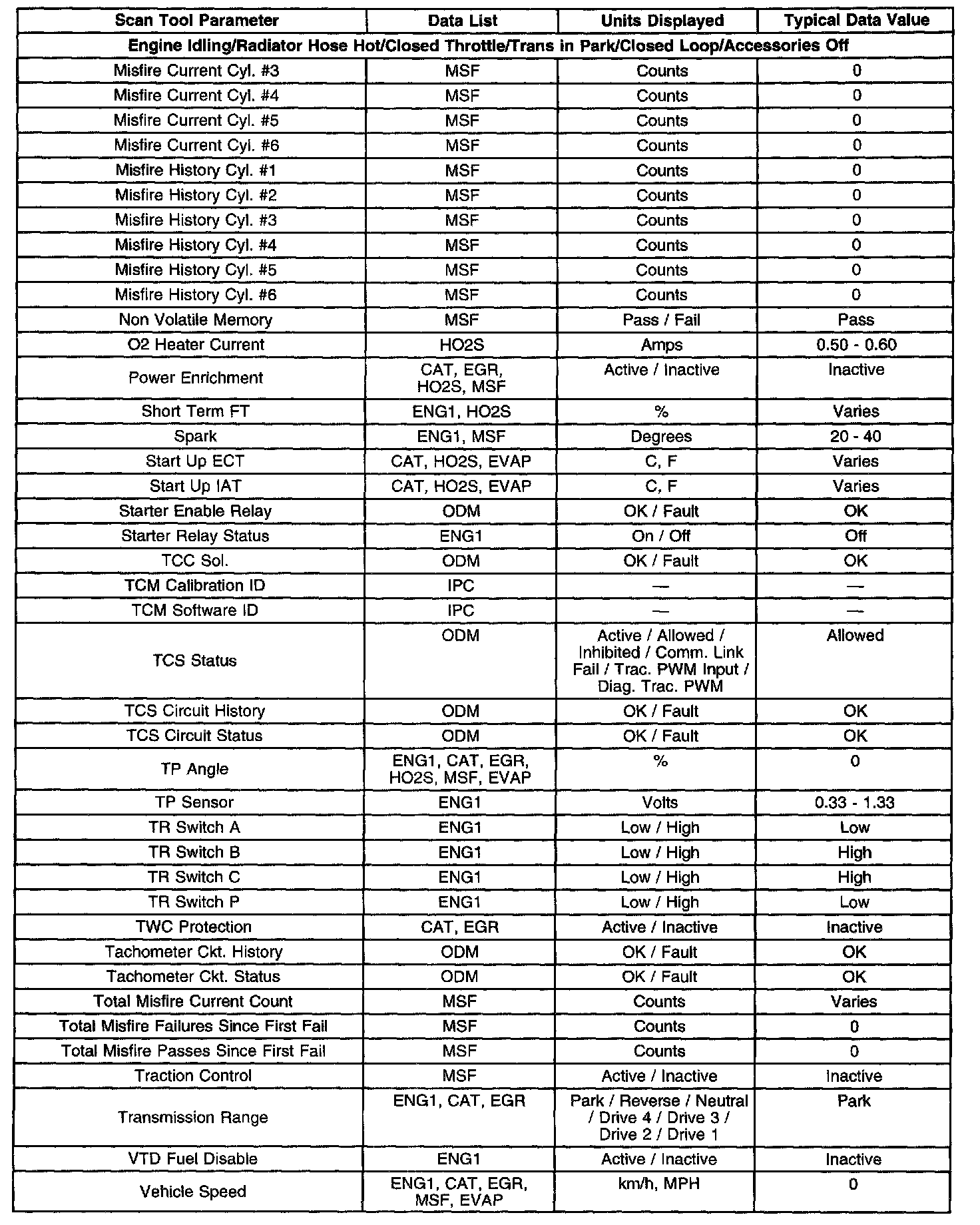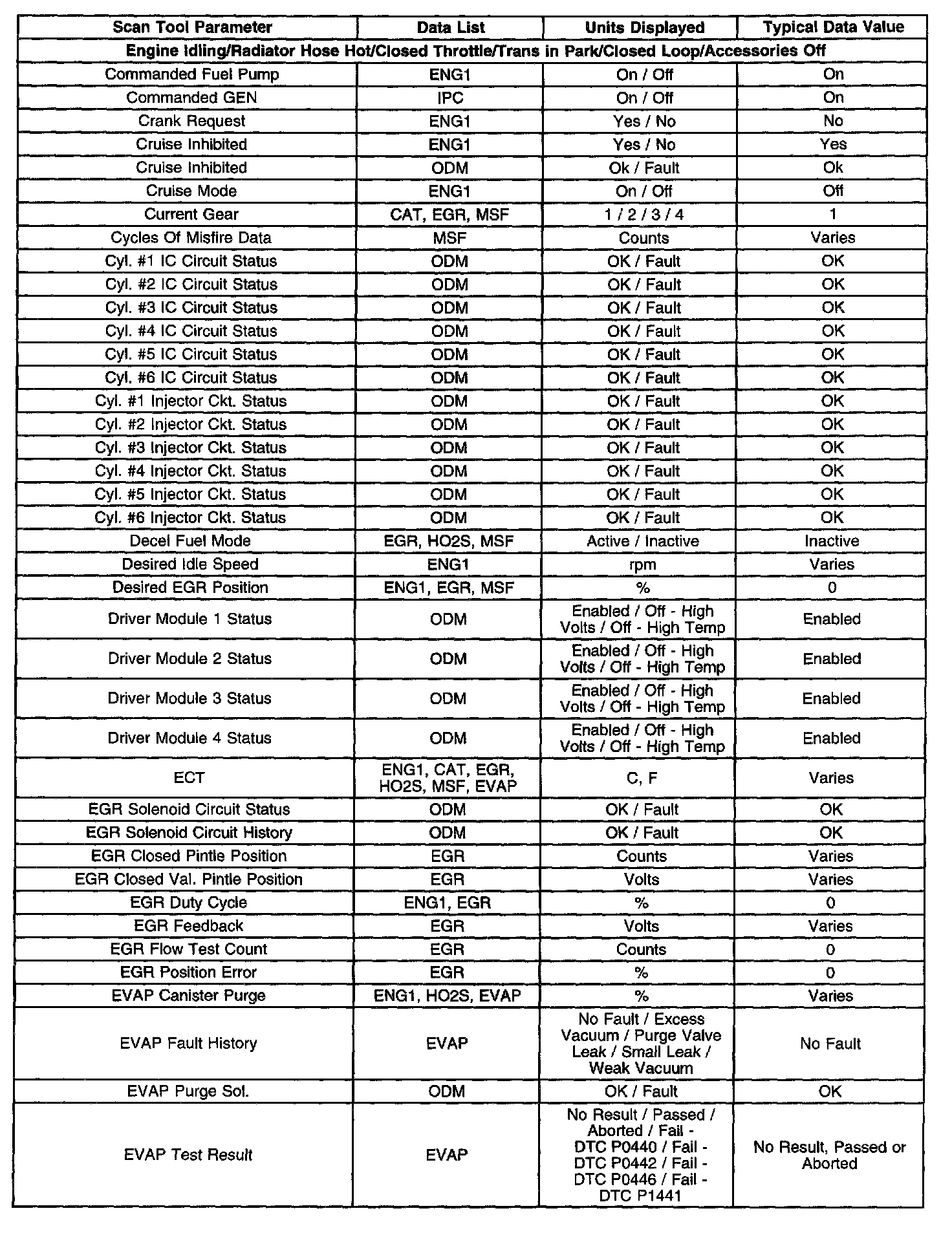 The Engine Scan Tool Data List contains all engine related parameters that are available on the scan tool. The list is arranged in alphabetical order. A given parameter may appear in any one of the data lists, and in some cases may appear more than once, or in more than one data list in order to group certain related parameters together.