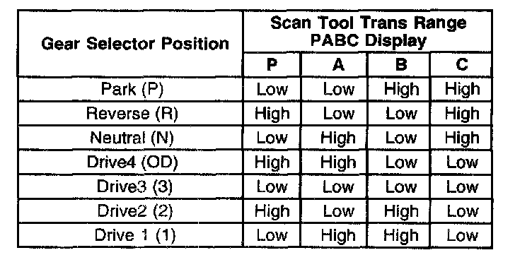 The transaxle range switch is part of the transaxle Park/Neutral Position (PNP) switch mounted on the transaxle manual shaft. The 4 inputs from the transaxle range switch indicate to the PCM which position is selected by the transaxle selector lever. This information is used for the transmission shift control, the ignition timing, the EVAP canister purge, and the EGR and IAC valve operations. The combination of the 4 transaxle range input states determines the PCM commanded shift pattern. The input voltage level at the PCM is high when the transaxle range switch is open and low when the switch is closed to ground. The state of each input is represented on the scan tool as High voltage level, Low voltage level. The 4 parameters represent transaxle range switch Parity, A, B, and C inputs respectively. The valid transaxle range input combinations are shown in the Transaxle Range Switch Valid Input Combinations table.
