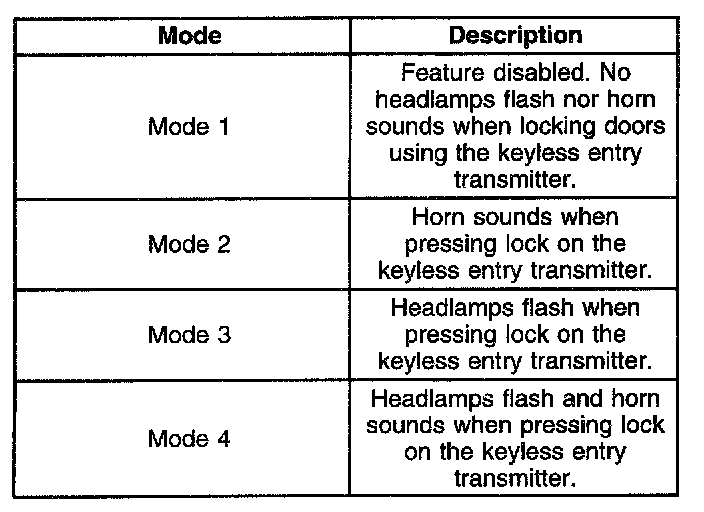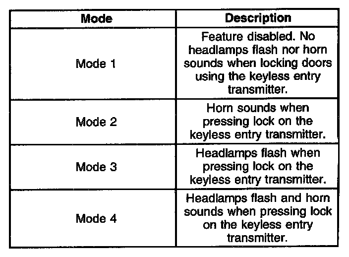 ^ The BCM sounds the chime a number of times equivalent to the remote lock verification mode. A transition past mode 4 repeats the sequence starting with mode 1.