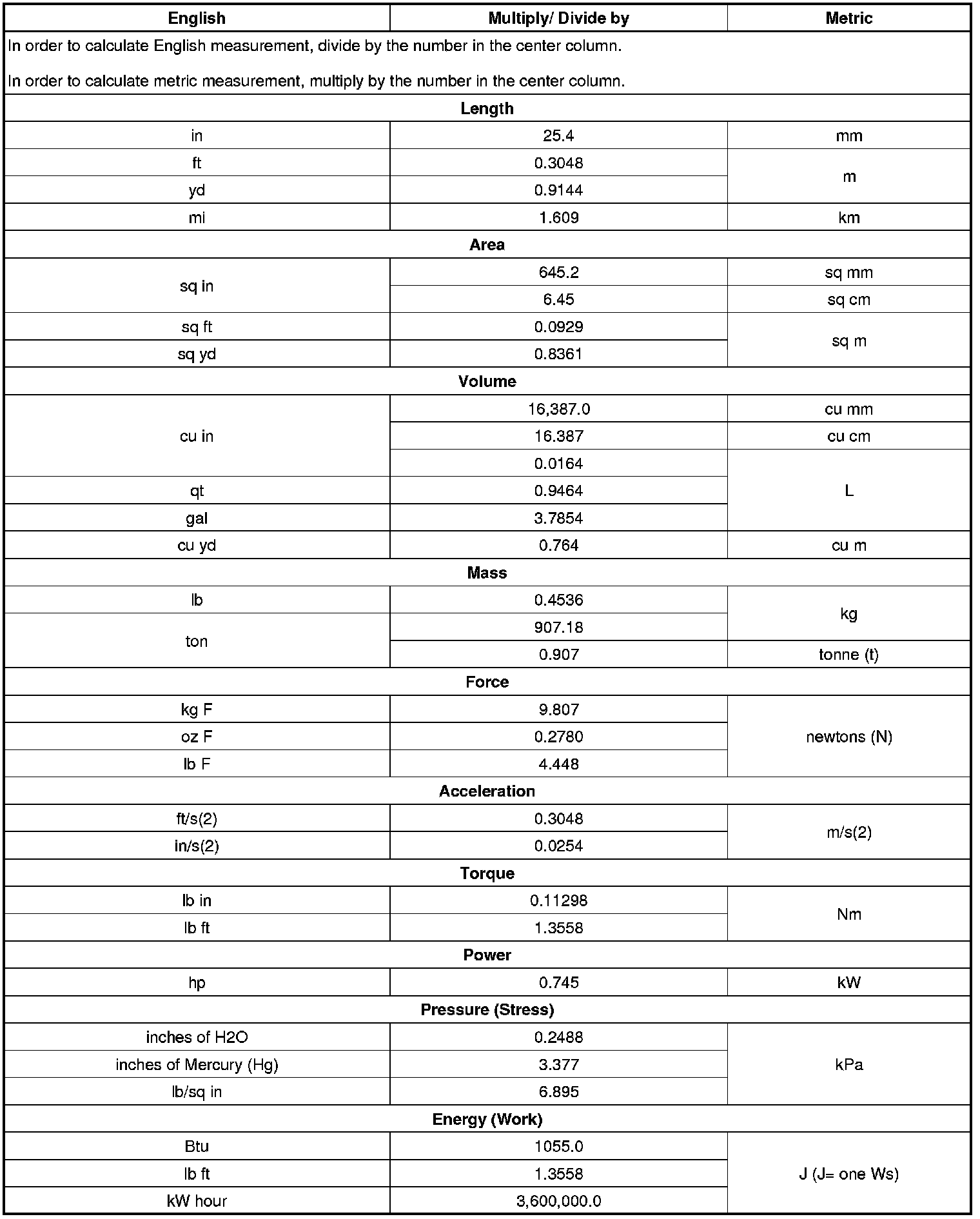 US English/Metric Conversion