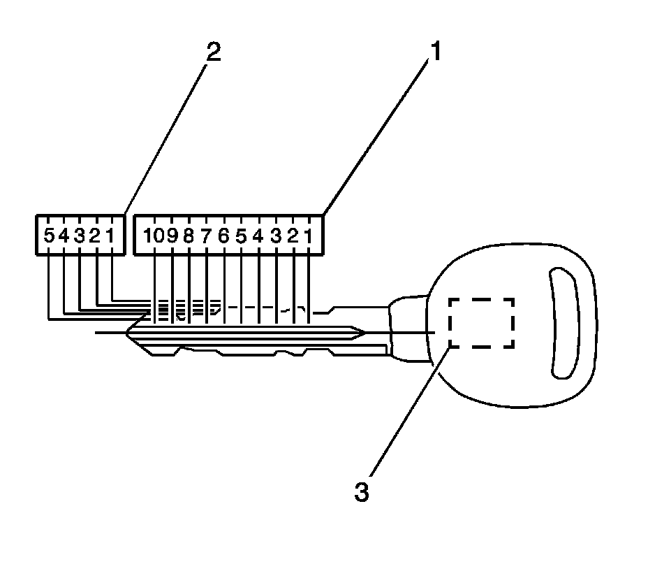 The key code can be obtained from the 5-digit number on the key tag that accompanies the original master and valet keys. The 5-digit key code cross references to the cut and tumbler sequence. The keys have 10-key cut positions (1) and 41/4 key cut depths (2). Key cut positions are numbered 1-10, counting from the head of the key to the tip. The key cut depths are 1-5 cut depth number 1 is the deepest cut. The key transponder (3) in the master and valet key must be programmed to the vehicle. Refer to Programming Theft Deterrent System Components .