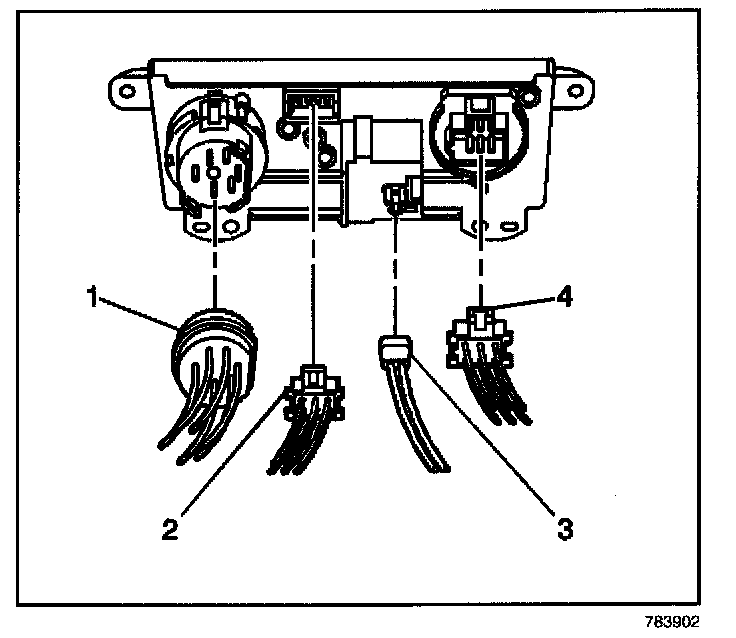 5. Disconnect the blower motor switch electrical connector (4) from the HVAC control assembly.