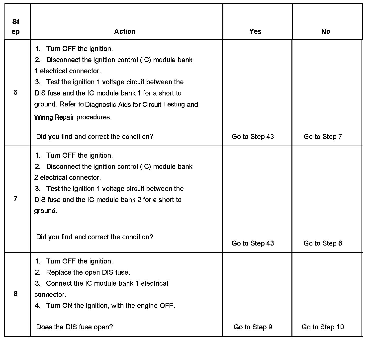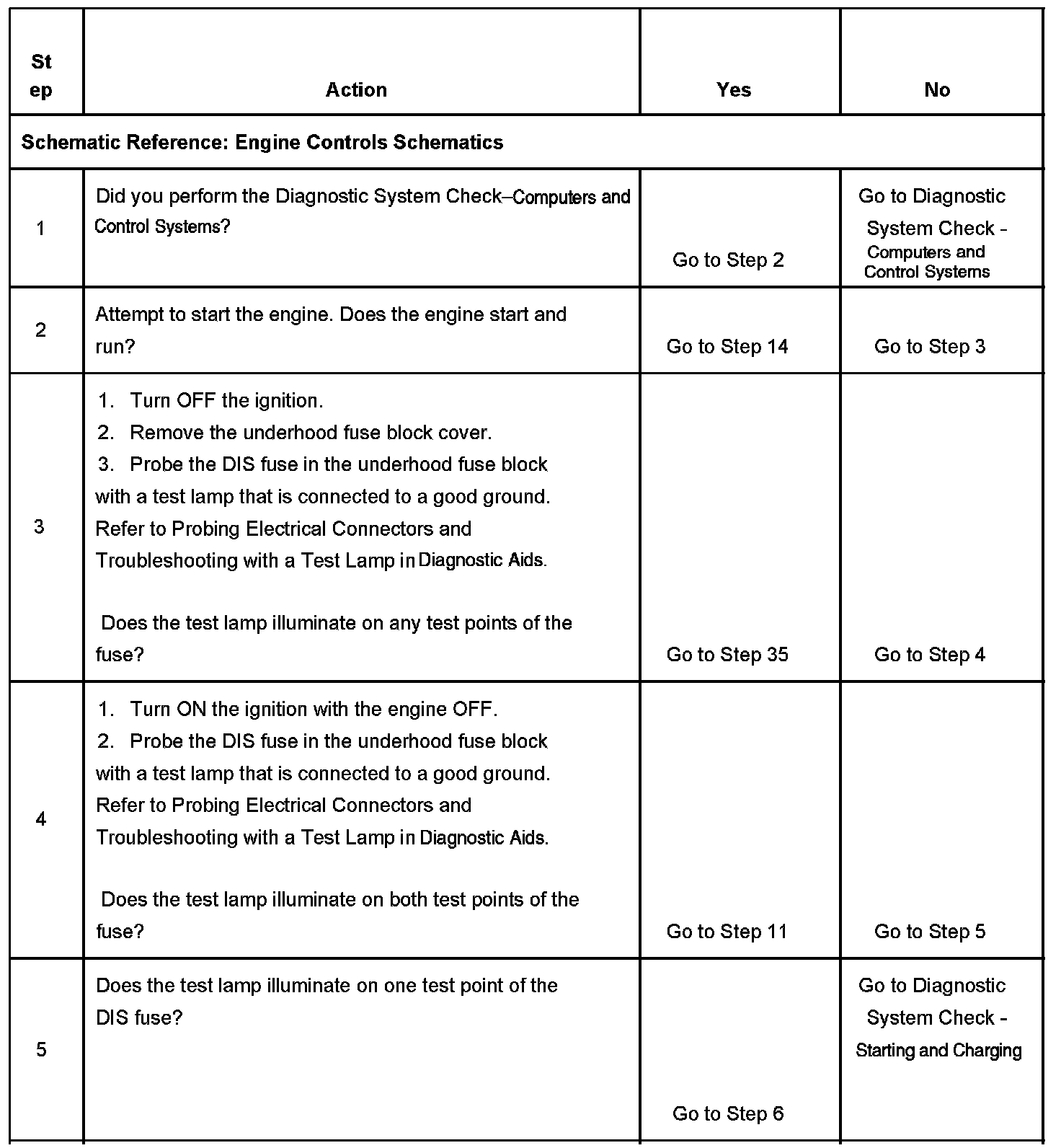 3. This step tests for a short to battery positive voltage on the ignition 1 voltage circuit. When the ignition is turned OFF, the test lamp should not illuminate at the DIS fuse.