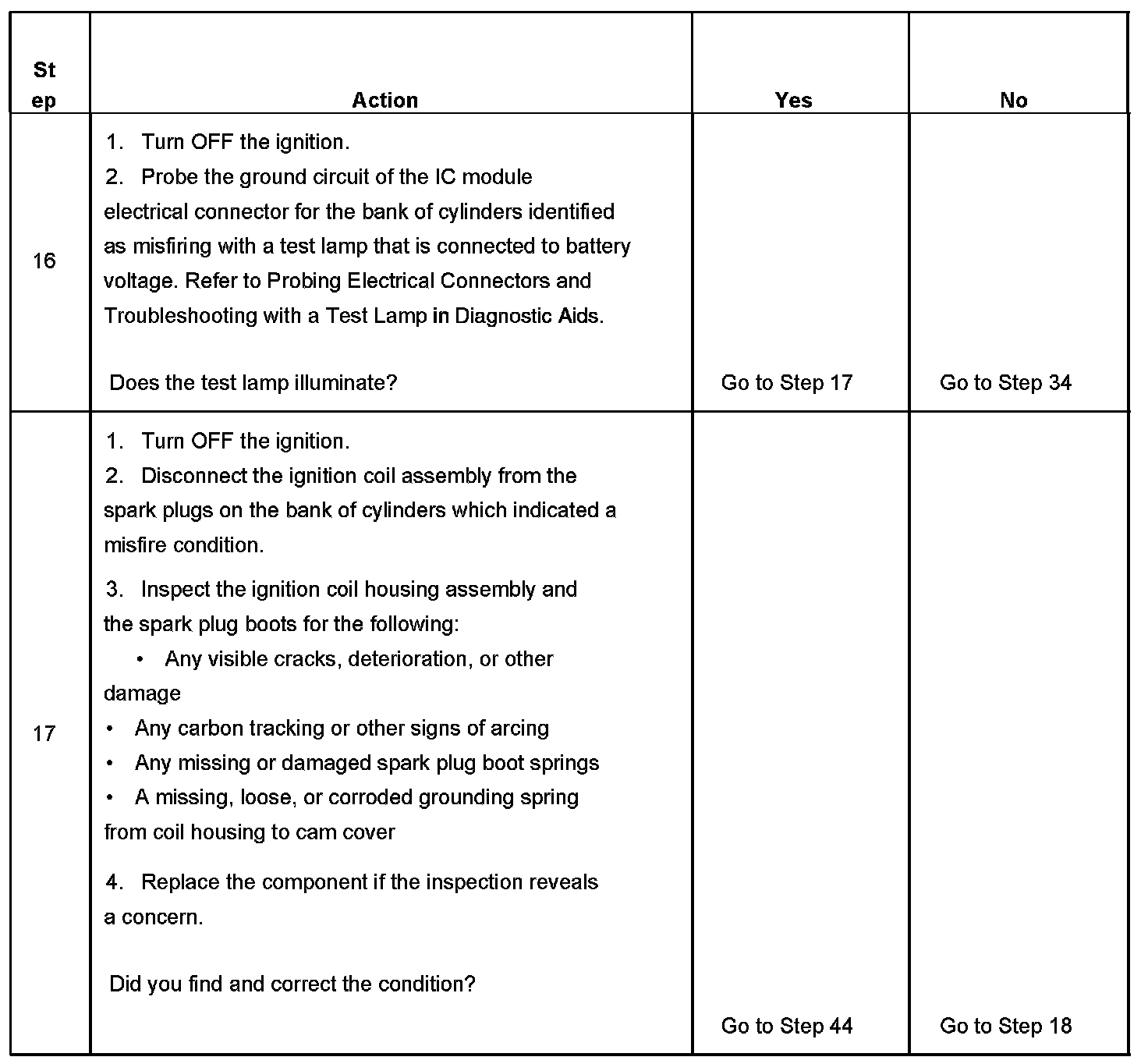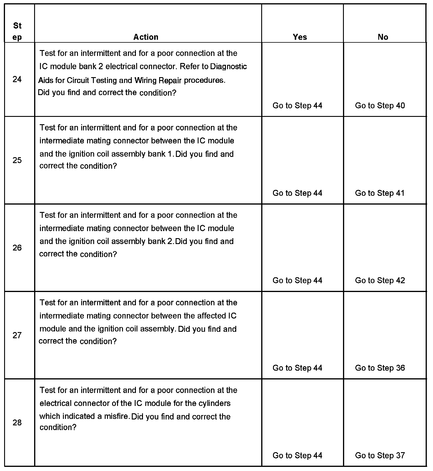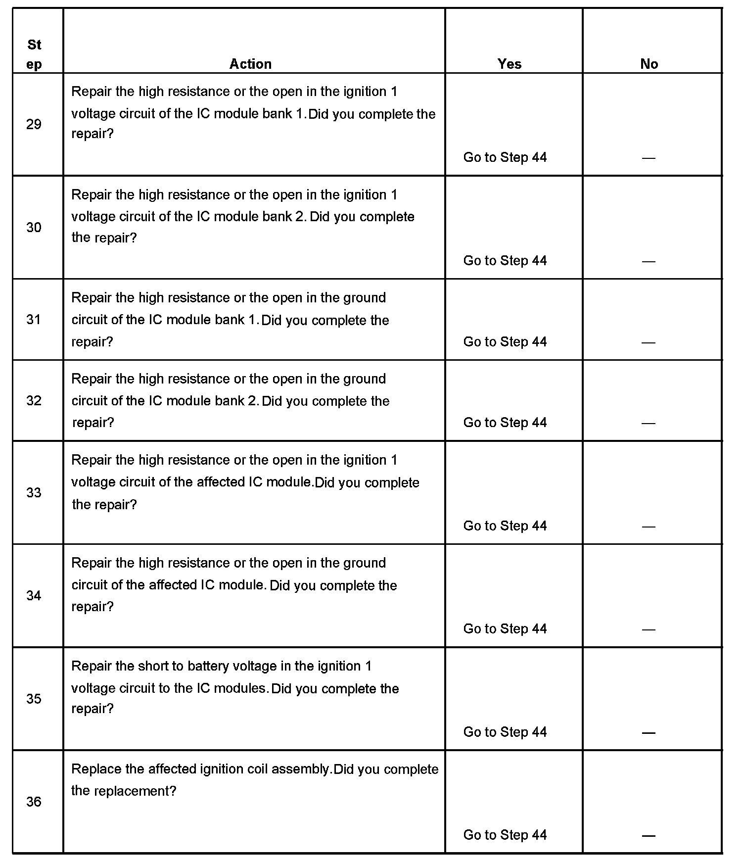 Each ignition coil connects directly to its spark plug through a wire spring conductor housed in a short spark plug boot. The IC circuits transmit timing pulses from the powertrain control module (PCM) to the IC modules which triggers the ignition coils in the proper sequence for spark plug firing. The PCM monitors each IC circuit for improper voltage levels. If an improper voltage level is detected on an IC circuit a DTC will set.
