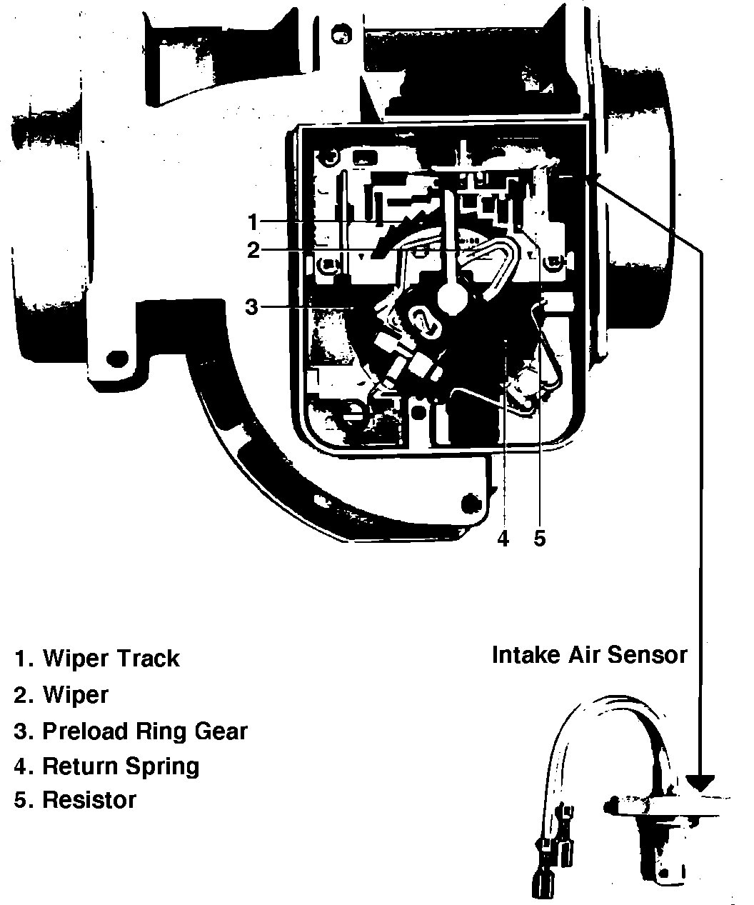 Intake air flow is measured by a spring loaded flap which is connected to a potentiometer. As air is drawn into the engine, the flap is deflected which causes the wiper contact of the potentiometer to move. The potentiometer signal represents the air volume entering the engine.