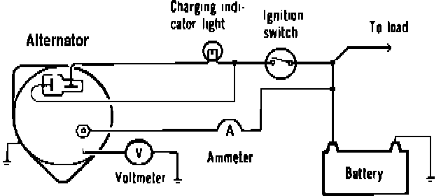 6. Operate engine at approximately 2500 RPM and note ammeter reading. After engine has been started, the ammeter reading will gradually decrease as the battery approaches a fully charged condition. Read the ammeter indication at its maximum value while increasing engine RPM. Refer to "Alternator and Regulator Specification Chart."