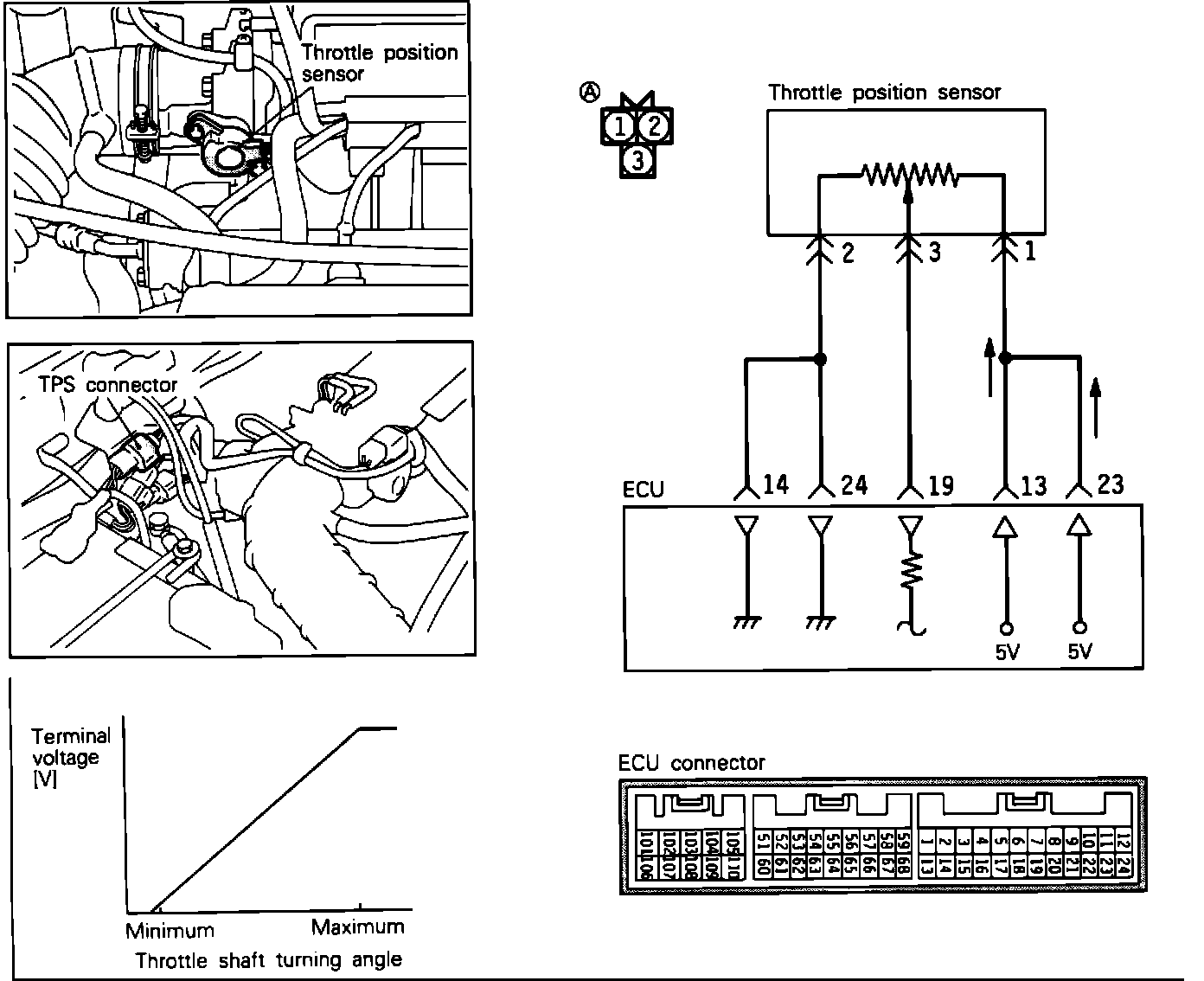 2. Using a high-impedance digital voltmeter, carefully back probe the throttle position connector into terminals 2 and 3.