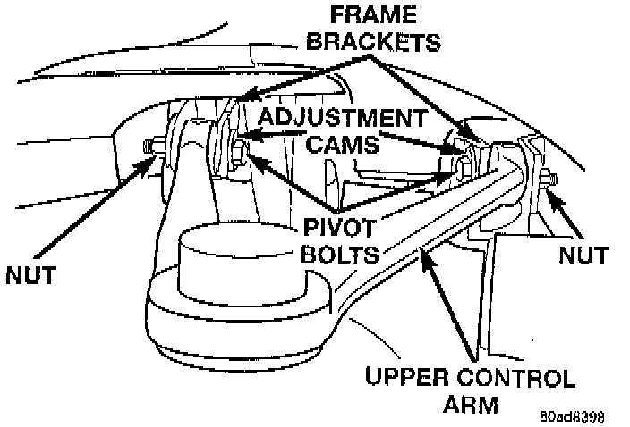 Camber angle adjustment involves the repositioning of the upper control arm pivot bolts using the adjustment cams. There are two cams one located on each pivot bolt for the upper control arm. Repositioning of the pivot bolt/cam moves the upper ball joint in or out to obtain the required camber specifications.