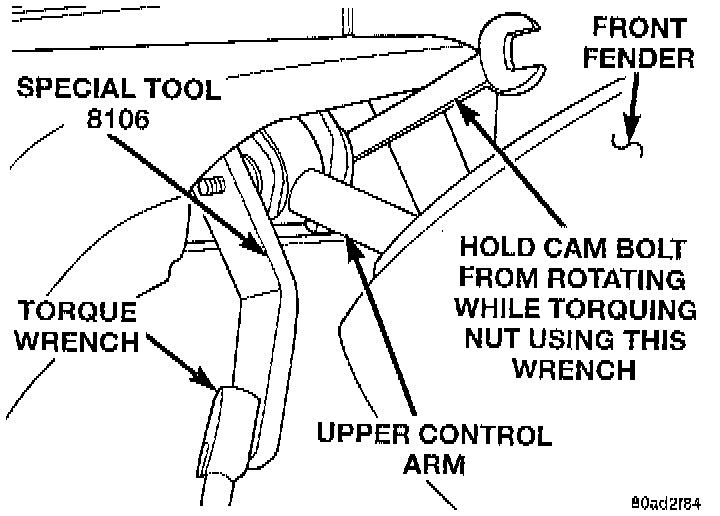 NOTE: When tightening the upper control arm cam bolts using Adapter, Special Tool 8106, the mechanical advantage of a torque wrench is increased by a factor of 1.5. For this reason the actual torque wrench reading or setting will be lower then the torque specification Example: If the torque specified is 108 Nm (80 ft. lbs.) the torque wrench reading or setting should be 72 Nm (53 ft. lbs.).