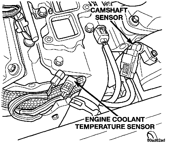 The engine coolant temperature sensor threads into the water jacket next to thermostat housing. The sensor provides an input to the Powertrain Control Module (PCM). As coolant temperature varies, the sensor resistance changes, resulting in a different input voltage to the PCM.