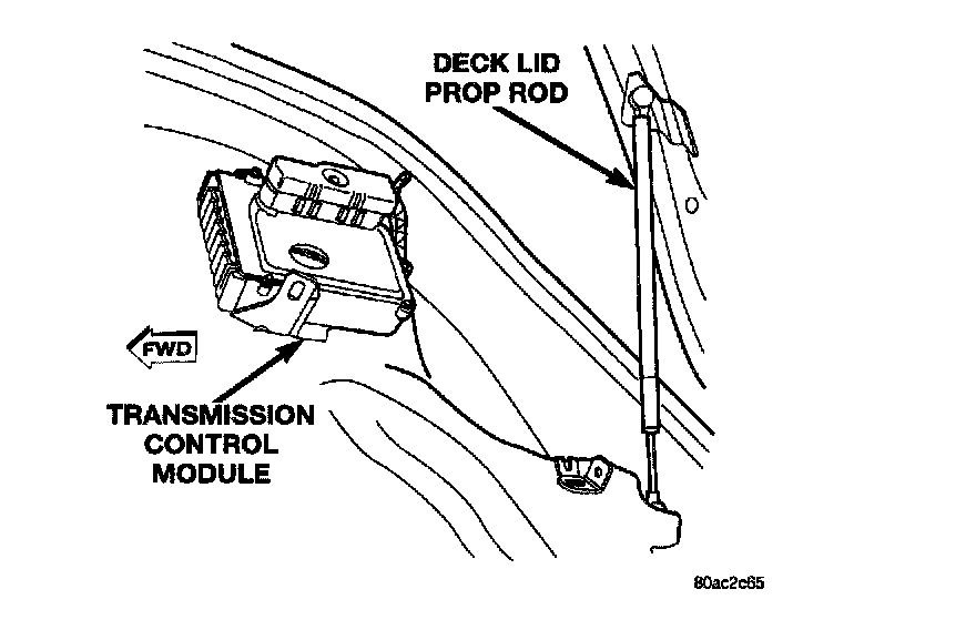 The transmission control module is located in the trunk compartment on the right side of the vehicle. It is held in place by four mounting screws.