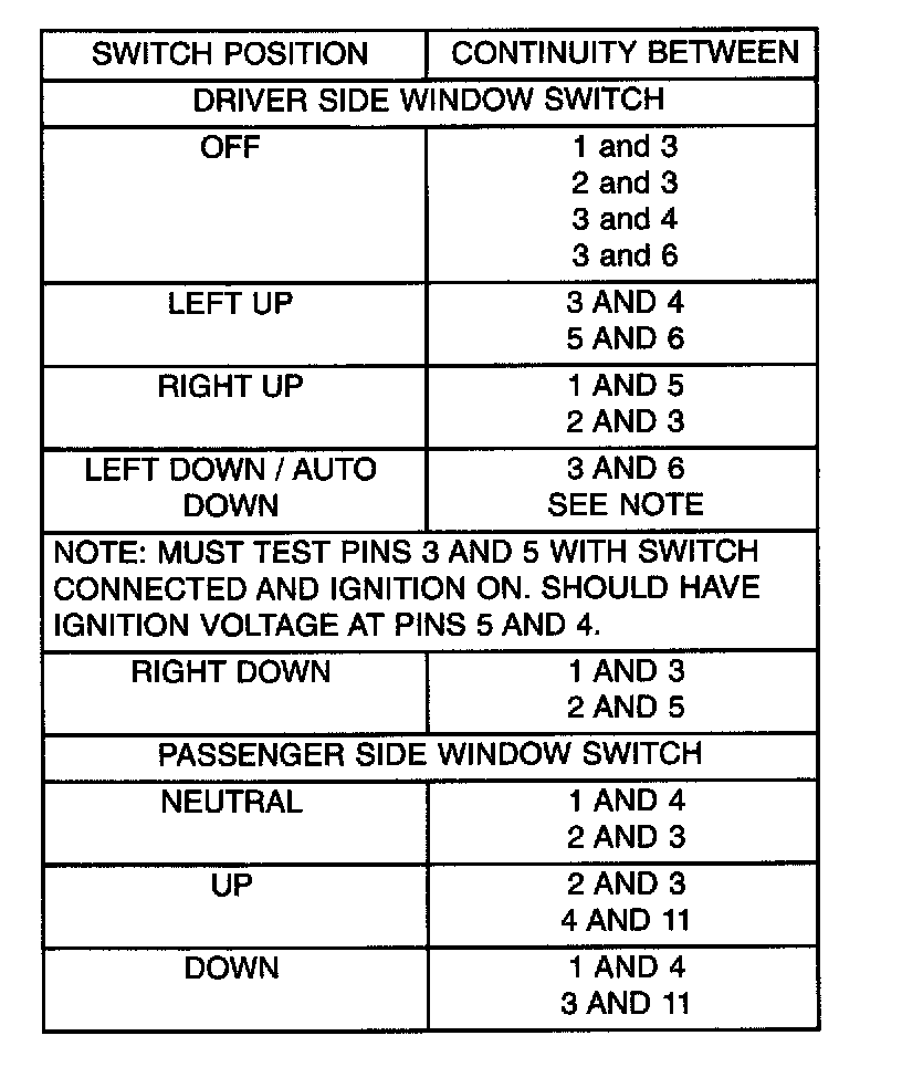 4. Test the power window switch continuity. See the Power Window Switch Continuity charts to determine if the continuity is correct in the Neutral, Up and Down switch positions and Power Window Switch Continuity test table. If OK, see Power Window Motor in the Diagnosis and Testing. If not OK, replace the faulty switch and bezel.