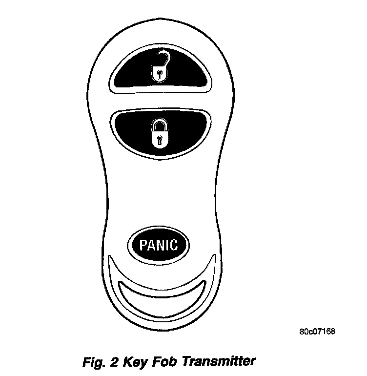 The key fob transmitter has three buttons to actuate and program the Remote Keyless Entry (RKE) system.