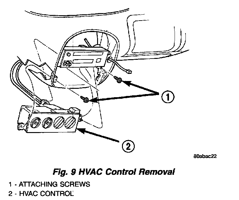 2. Remove the HVAC control attaching screws. Pull the control out to disconnect two electrical connectors and two control cables.