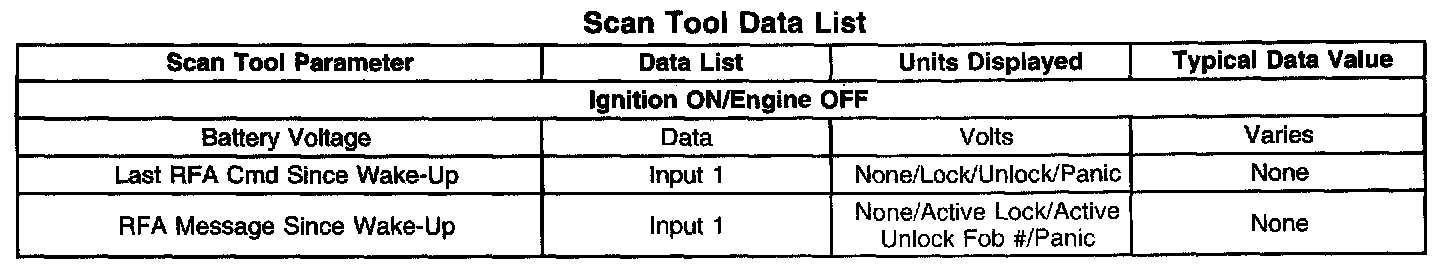 The Keyless Entry Scan Tool Data List contains all of the keyless entry related parameters that are available on the scan tool. The parameters in the list are arranged in alphabetical order. The column, "Data List," indicates the location of the parameter within the scan tool menu selections. Use the Keyless Entry Scan Tool Data List as directed by a diagnostic table or in order to supplement the diagnostic procedures. Begin all of the diagnostic procedures with Diagnostic System Check - Remote keyless Entry.