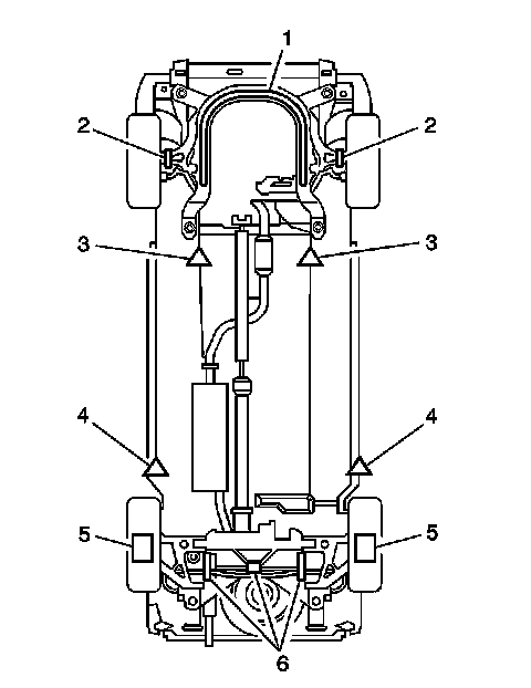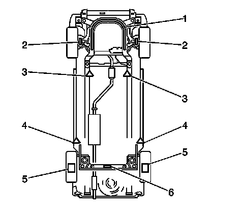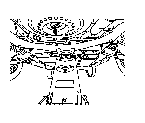 Caution: To avoid any vehicle damage, serious personal injury or death when major components are removed from the vehicle and the vehicle is supported by a hoist, support the vehicle with jack stands at the opposite end from which the components are being removed and strap the vehicle to the hoist.