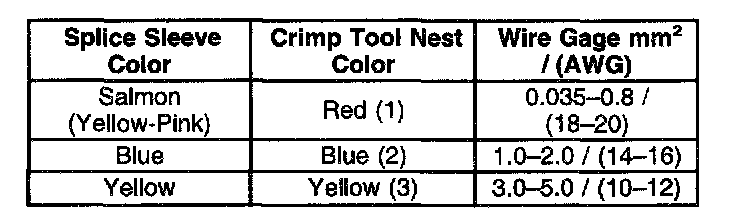 4. Select the proper sealed splice sleeve according to the wire size. Refer to the above table at the beginning of the repair procedure for the color coding of the splice sleeves and the crimp tool nests.