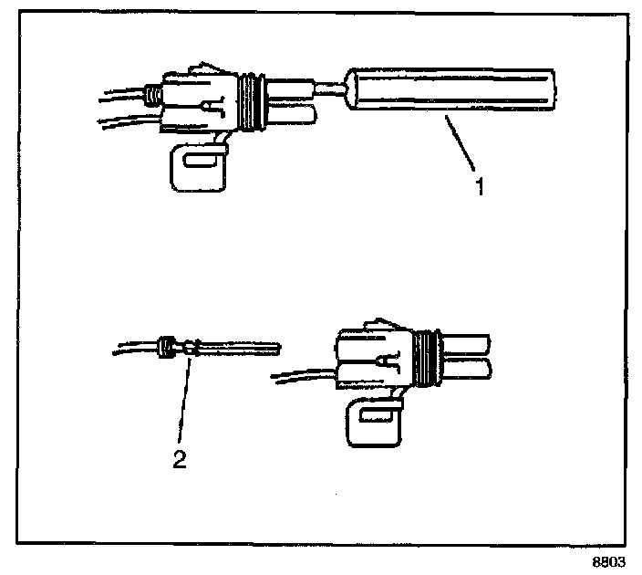 4. Insert the Weather Pack� terminal removal tool into the front (mating end) of the connector cavity until it rests on the cavity shoulder (1).
