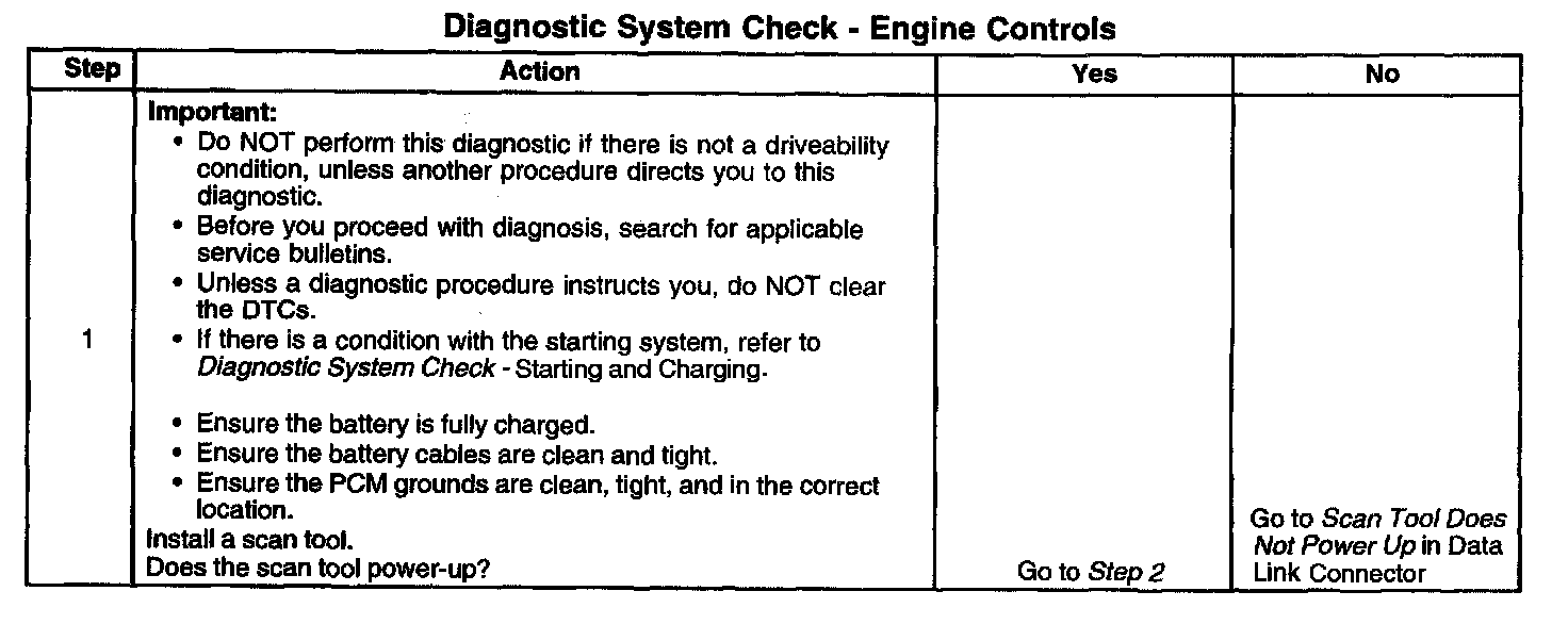 DESCRIPTIONThe Diagnostic System Check-Computer and Control systems is an organized approach to identifying a condition that is created by a malfunction in the powertrain control system. The Diagnostic System Check must be the starting point for any driveability concern. The Diagnostic System Check directs the service technician to the next logical step in order to diagnose the concern. Understanding and correctly using the diagnostic table reduces diagnostic time, and prevents the replacement of good parts.