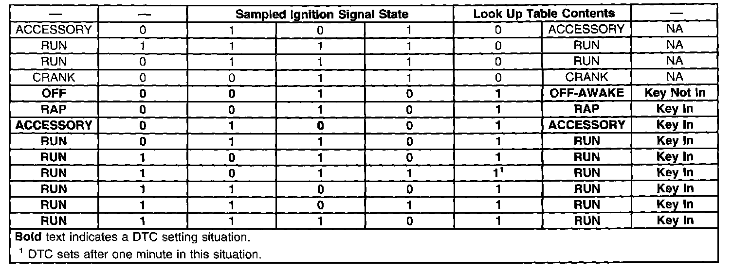 The modules that depend exclusively on serial data messages for power modes stay in the state dictated by the last valid PMM message until they can check for the engine run flag status on the serial data circuits. If the PMM fails, the modules monitor the serial data circuit for the engine run flag serial data. If the engine run flag serial data is True, indicating that the engine is running, the modules fail-safe to "RUN". In this state the modules and their subsystems can support all operator requirements. If the engine run flag serial data is False, indicating that the engine is not running, the modules fail-safe to "OFF-AWAKE". In this state the modules are constantly checking for a change status message on the serial data circuits and can respond to both local inputs and serial data inputs from other modules on the vehicle.