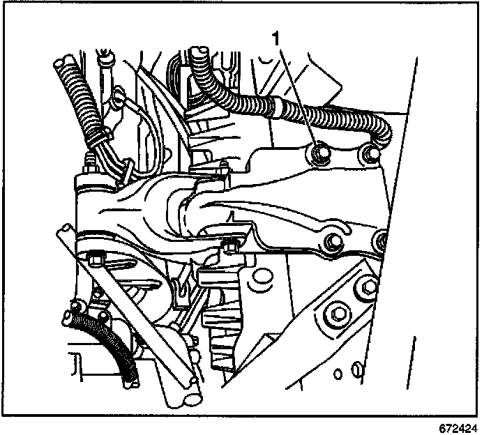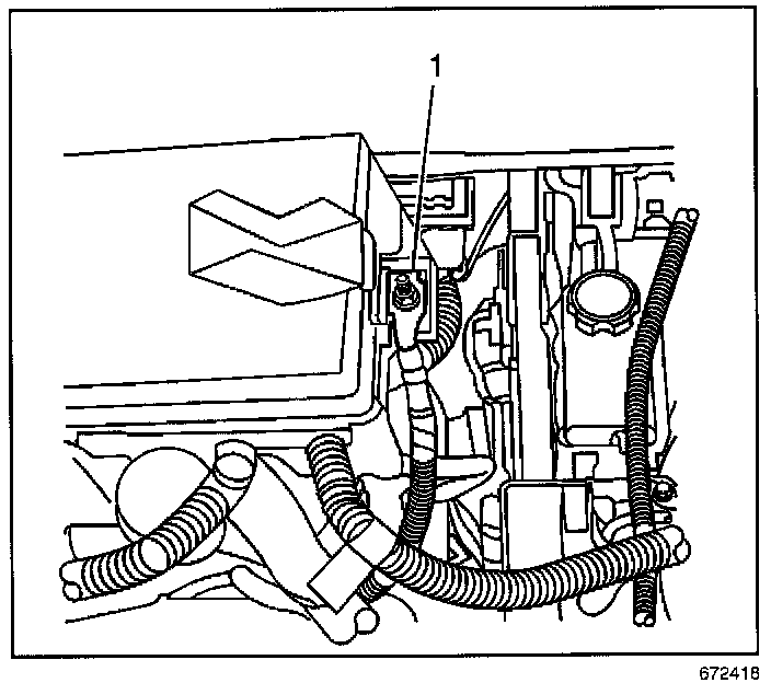 8. The final connection is made to the upper engine mount body bracket retaining bolt (1) or, a heavy, unpainted metal engine part of the vehicle with the discharged battery.
