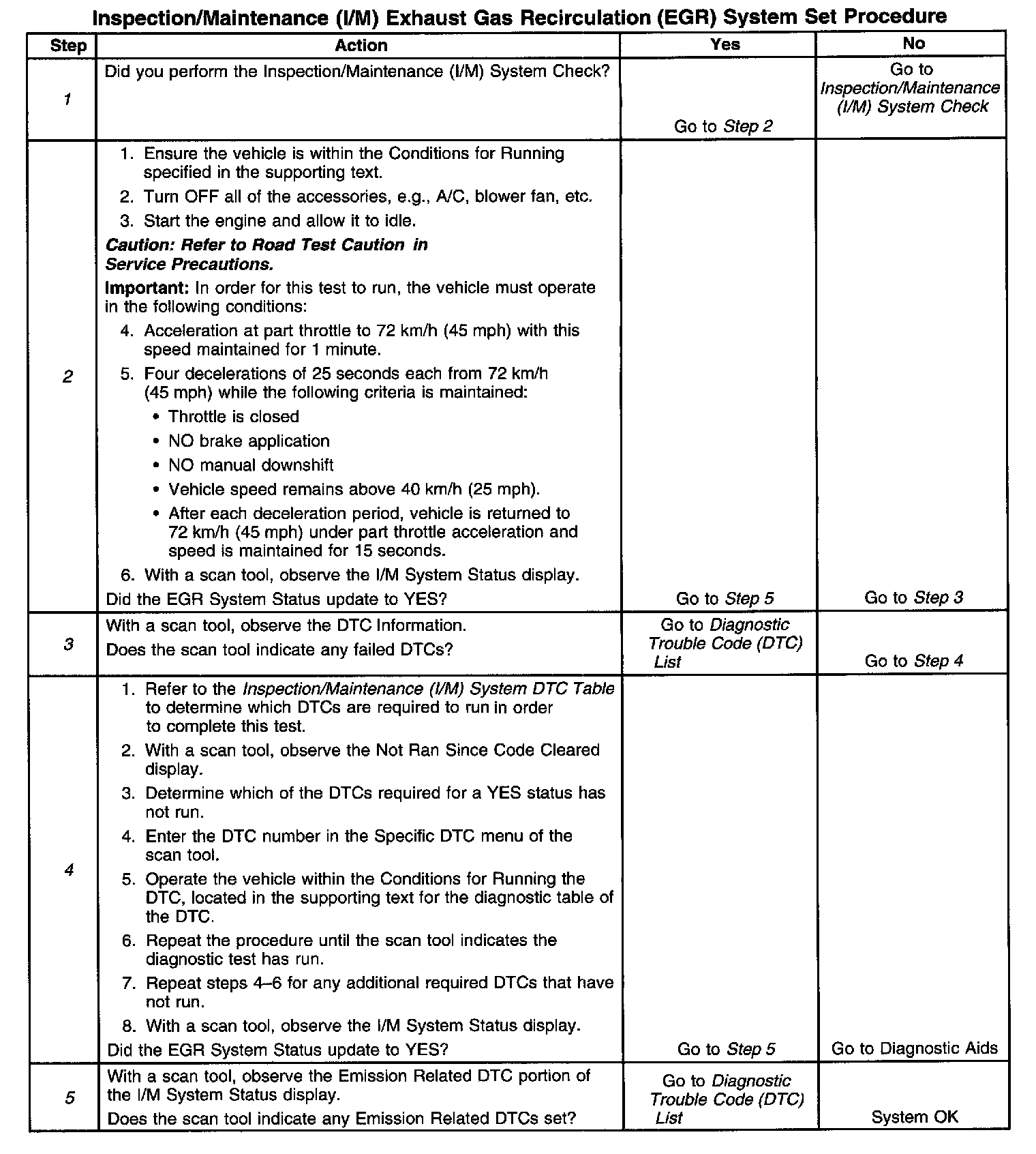 The control module only runs the EGR Active Tests during a gradual deceleration with a closed throttle and a vehicle speed above 40 km/h (25 mph). Several deceleration cycles may be necessary in order to accumulate a sufficient number of EGR flow samples. The procedure outlined in the table is for a clear, flat road. If the procedure is performed on a road with a slight down hill grade, the test may acquire the necessary sample counters in one or two decel trips. If the test is interrupted during the procedure, it may take more than three deceleration cycles to complete the test. If the status does not update, the test outlined in this procedure can be repeated until the I/M System Status updates to YES.
